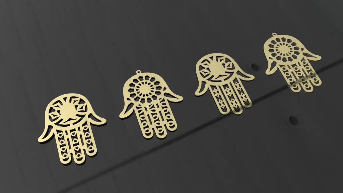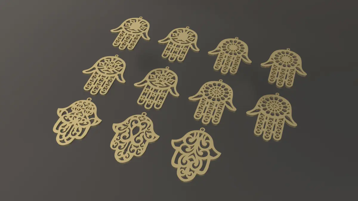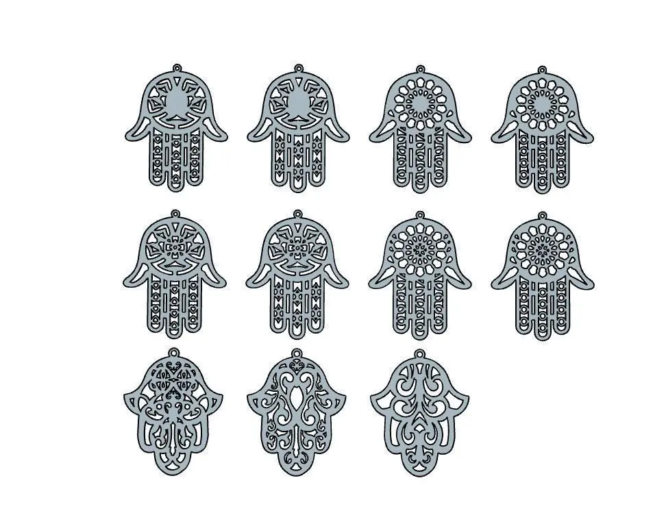 11 model of hamsa pendant ready to print dimention 5*4 cm have DXF file for person use CNC machine for laser cutting all parts are fixced and checked before publishing enjoy art if you like my work like and comment pls iif you need any change or editing text me i will be happy to help you
