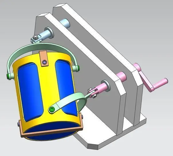 This is an application of the Schatz linkage which consists of 5 movable links. Center distance of revolute joints of two green grippers and the yellow cage are equal (= a). Center distance between pink and blue shafts = a*sqrt(3) = 1.732aThe materials to be mixed are in the blue container with 3D complex motion.