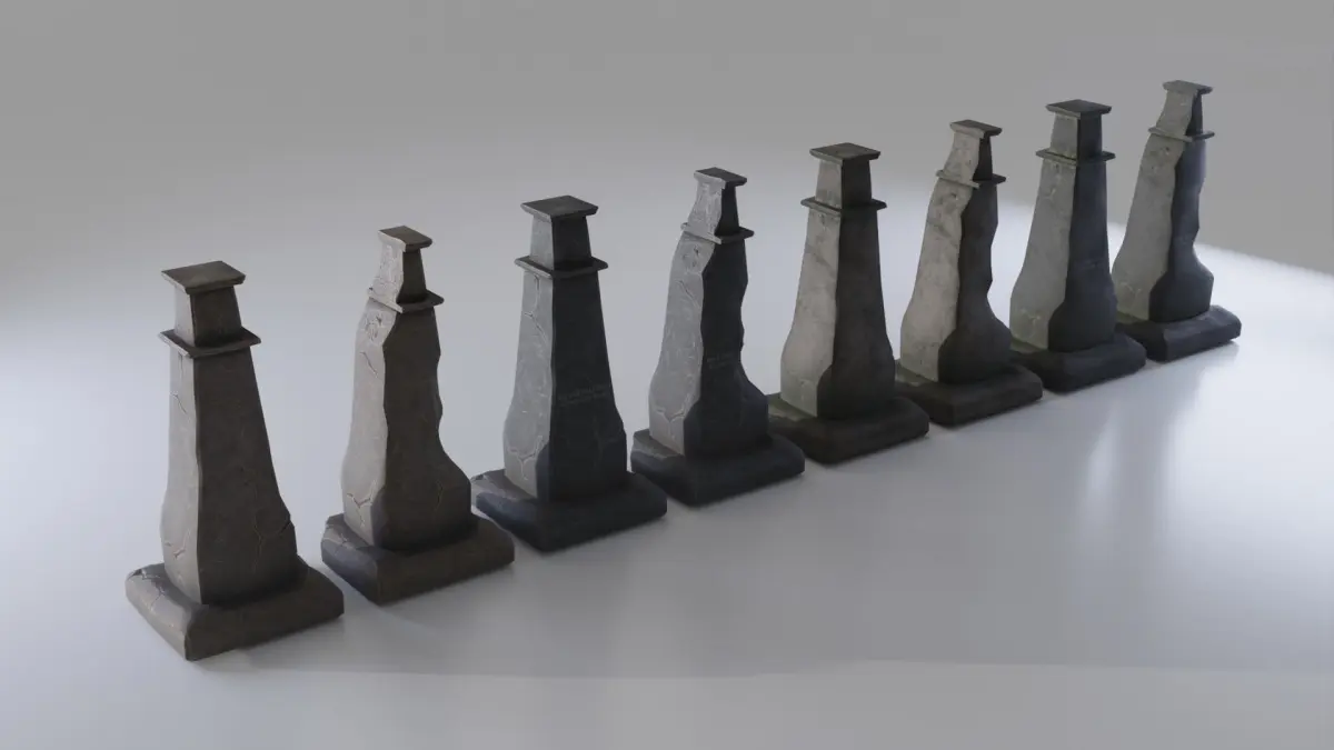 Contain 2 gravestone models - normal and damaged Each gravestone has 4 variation: Dark Clean, Light Clean, Dark Dirty, Light Dirty
