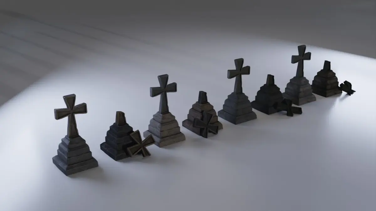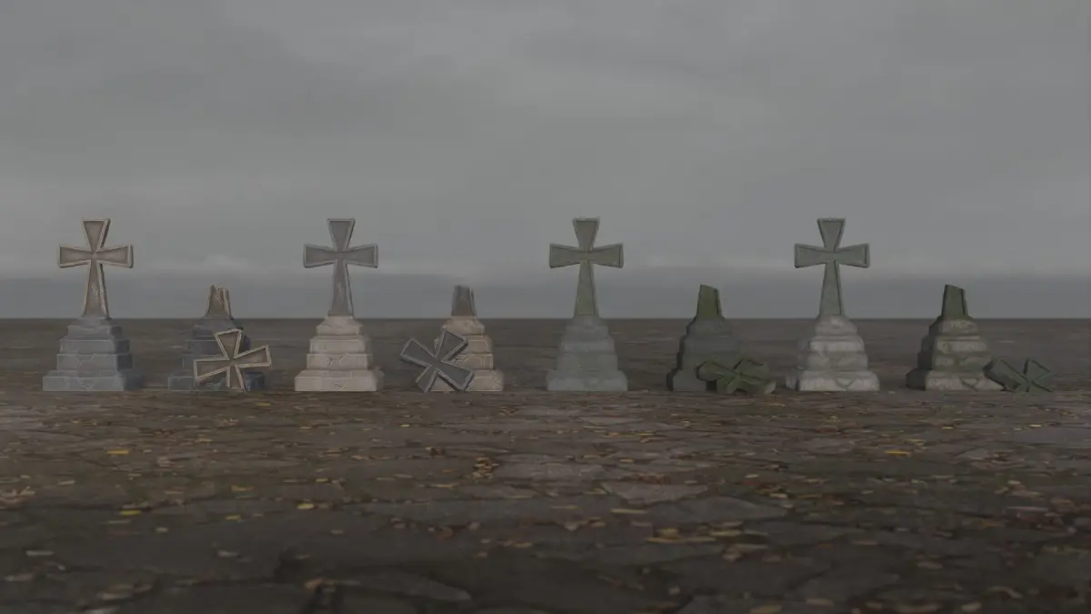 Contain 2 gravestone models - normal and damaged Each gravestone has 4 variation: Dark Clean, Light Clean, Dark Dirty, Light Dirty
