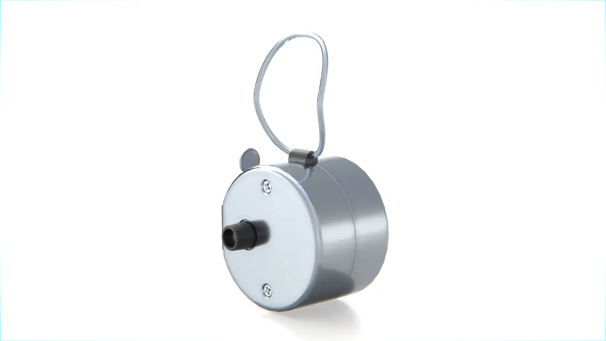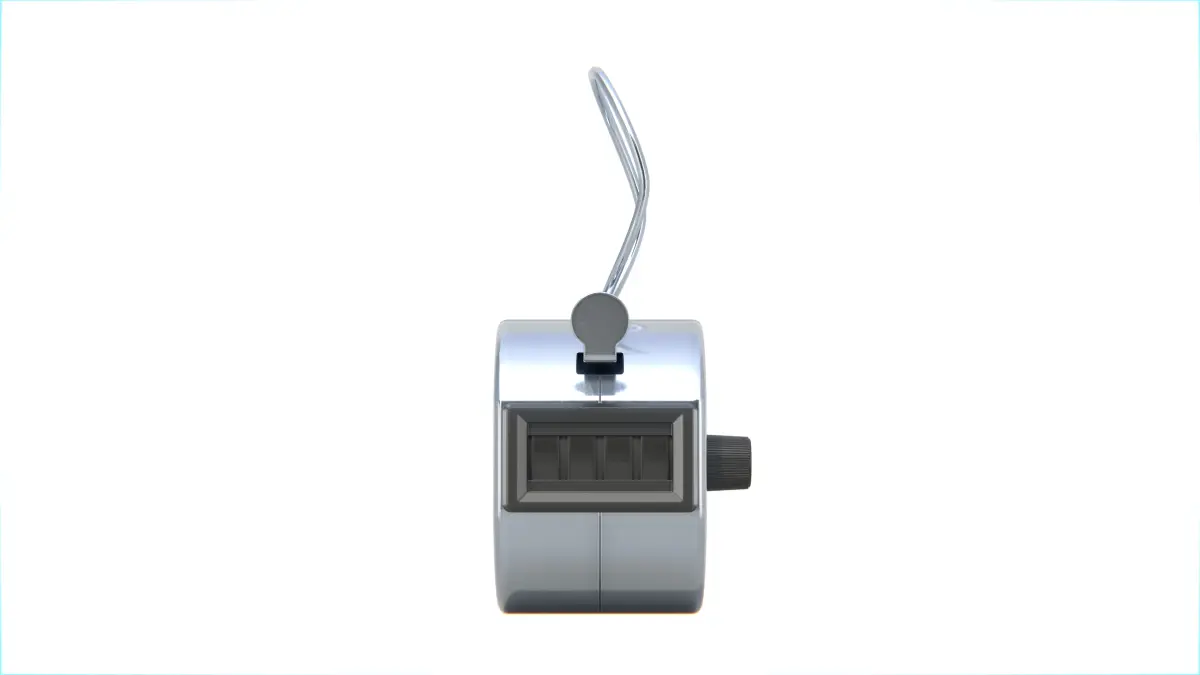 This 3D model features a classic hand tally counter, widely used for counting tasks across various industries. It presents a clean chrome-finished mechanical body with a four-digit display, push button operation, and a reset knob on the side. The round shape with metallic handle allows for easy handheld operation.
