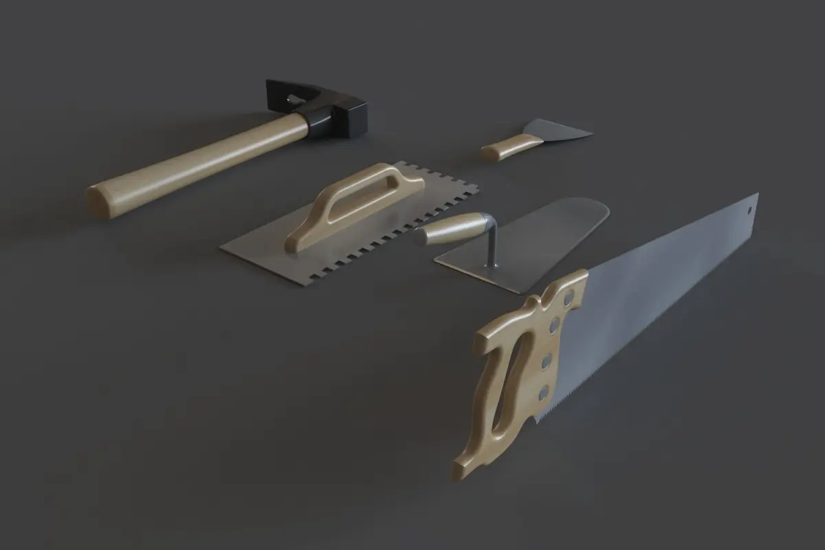 Set includes a saw, two spatula different samples, a trowel and an adze. Models are in real world scale.