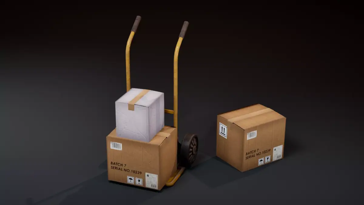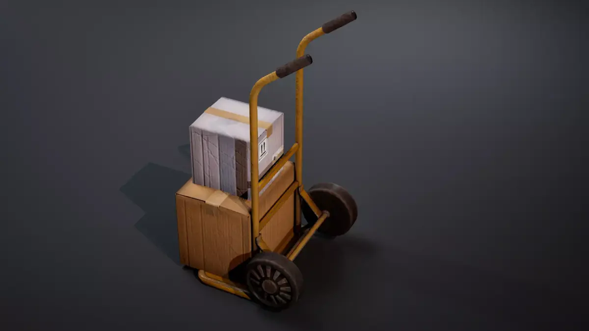A detailed and optimized 3D hand trolley paired with two cardboard boxes.