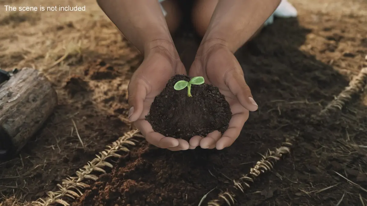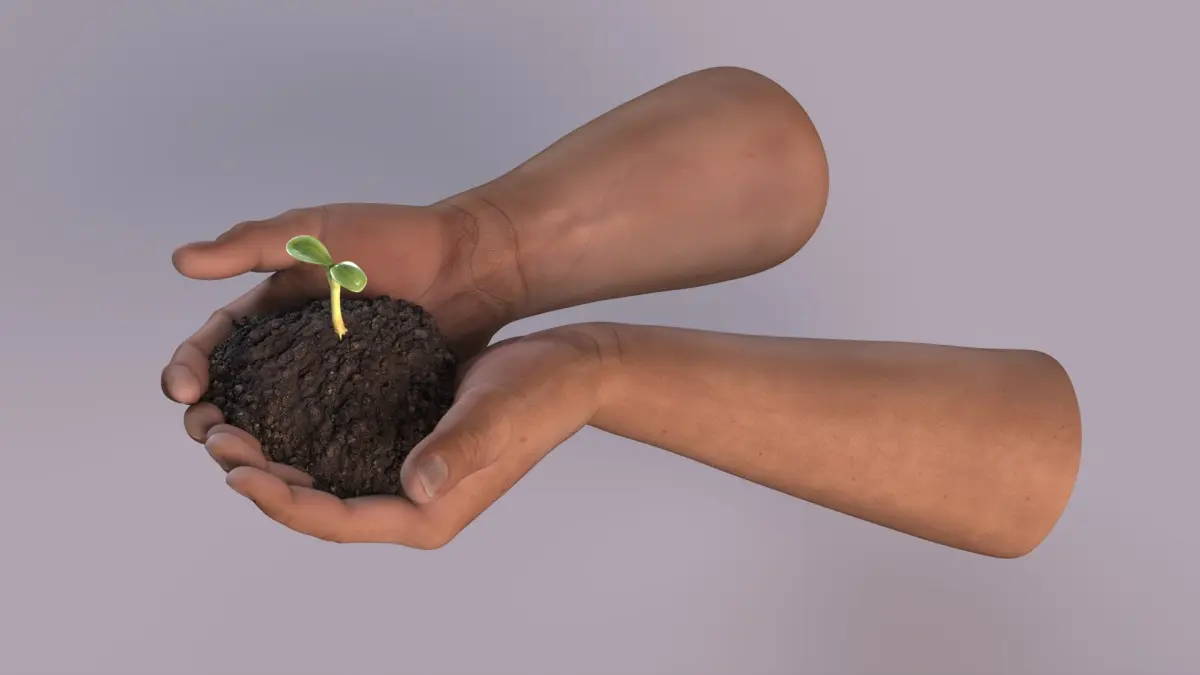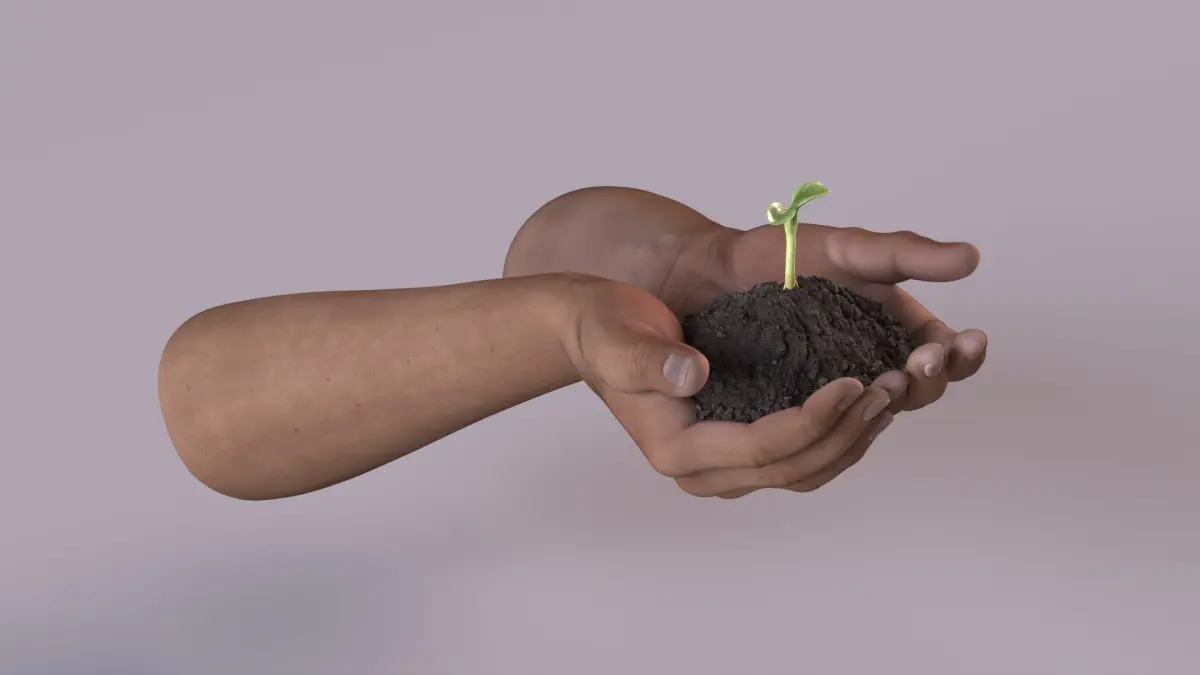 Hands Holding Seedling is a three-dimensional model of pair of hands gently cradling a small seedling, symbolizing care and growth in environmental or agricultural contexts.