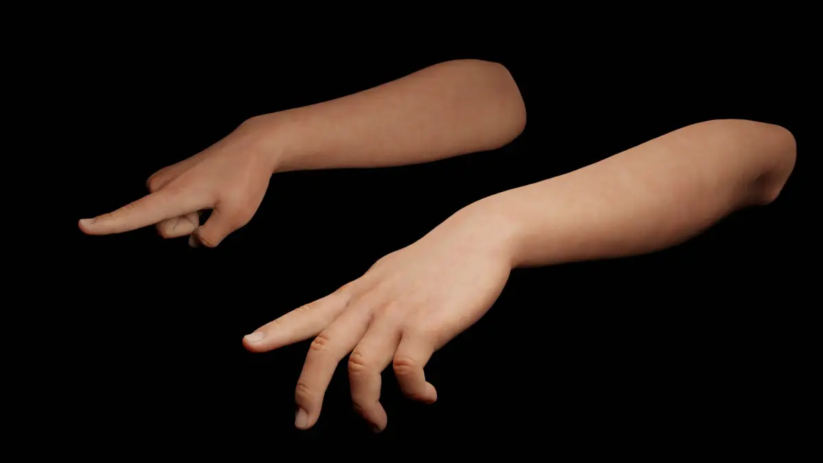 These 3D models of right and left hands are made in Blender and rendered in Cycles. The models have clean geometry, non overlapping UVs. They are textured rigged and animated. The scene is organized in appropriate groups and layers, and all the meshes, bones in the rig, materials, textures, lights and camera are given appropriate names, instead of using the default names.