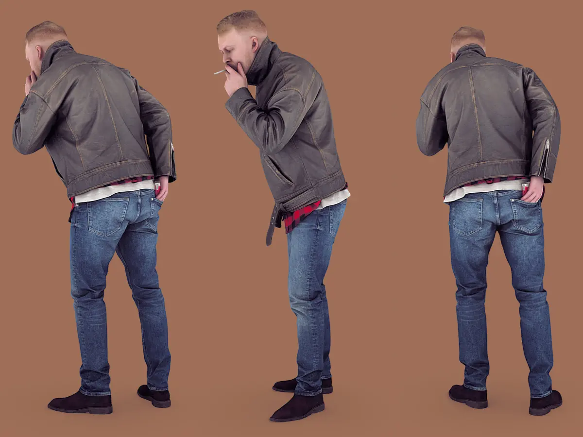 A young man, a nice guy, a citizen, a tourist, a student, in a vintage leather jacket and jeans, stands with a cigarette in his hands, lights.