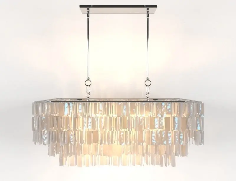 Description brand: Tiers of shimmering natural capiz shells—often referred to as glass oysters because of their fragile, translucent appearance—are hand cut and hand strung by talented Filipino artisans to create this piece, which casts a beautifully luminous glow over a dining table.