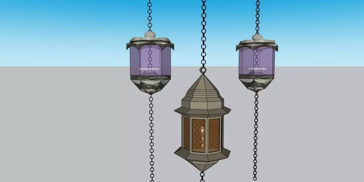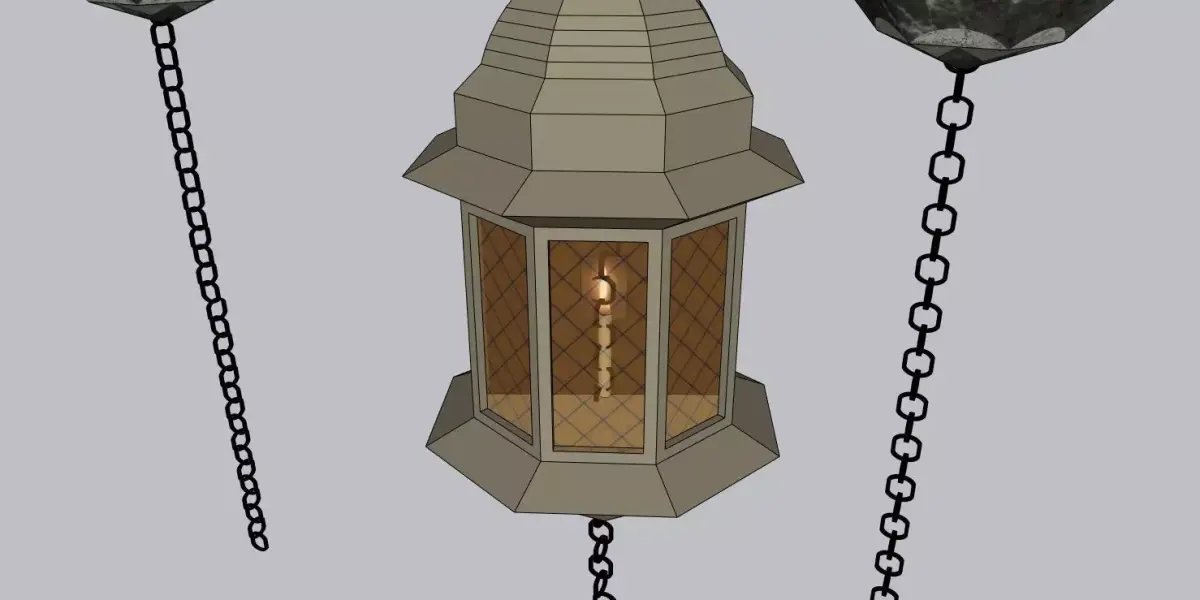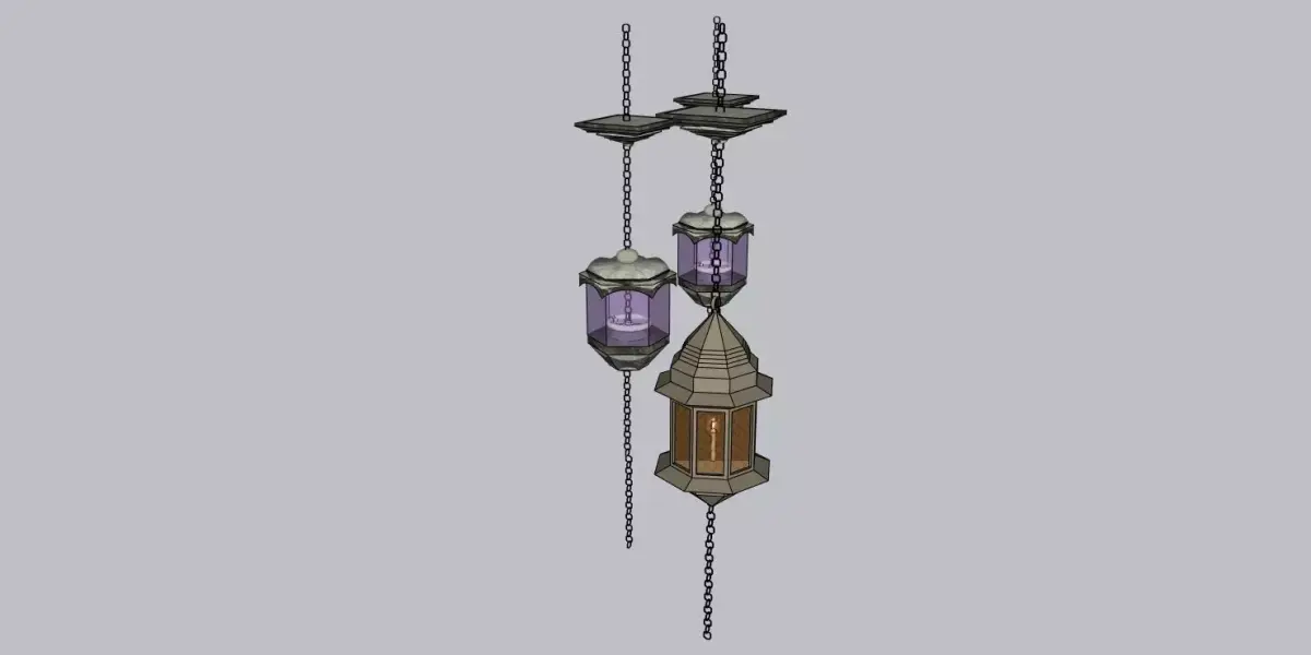 This 3D model features a beautifully designed hanging lantern light, perfect for adding a touch of elegance and charm to both modern and traditional spaces. The lantern has an intricate design with three separate lanterns suspended from chains, featuring geometric shapes and glass panes with a glowing candle inside. This piece is ideal for use in interior renders, outdoor spaces, or as part of decorative lighting solutions. Designed in SketchUp and compatible with various 3D platforms such as 3ds Max and FBX.