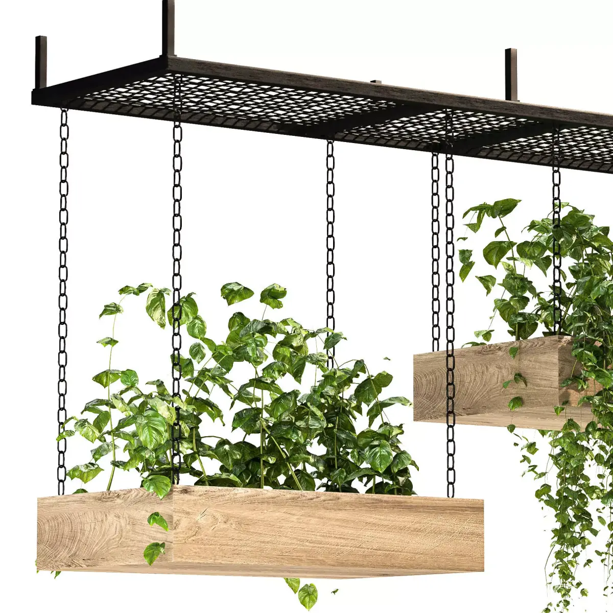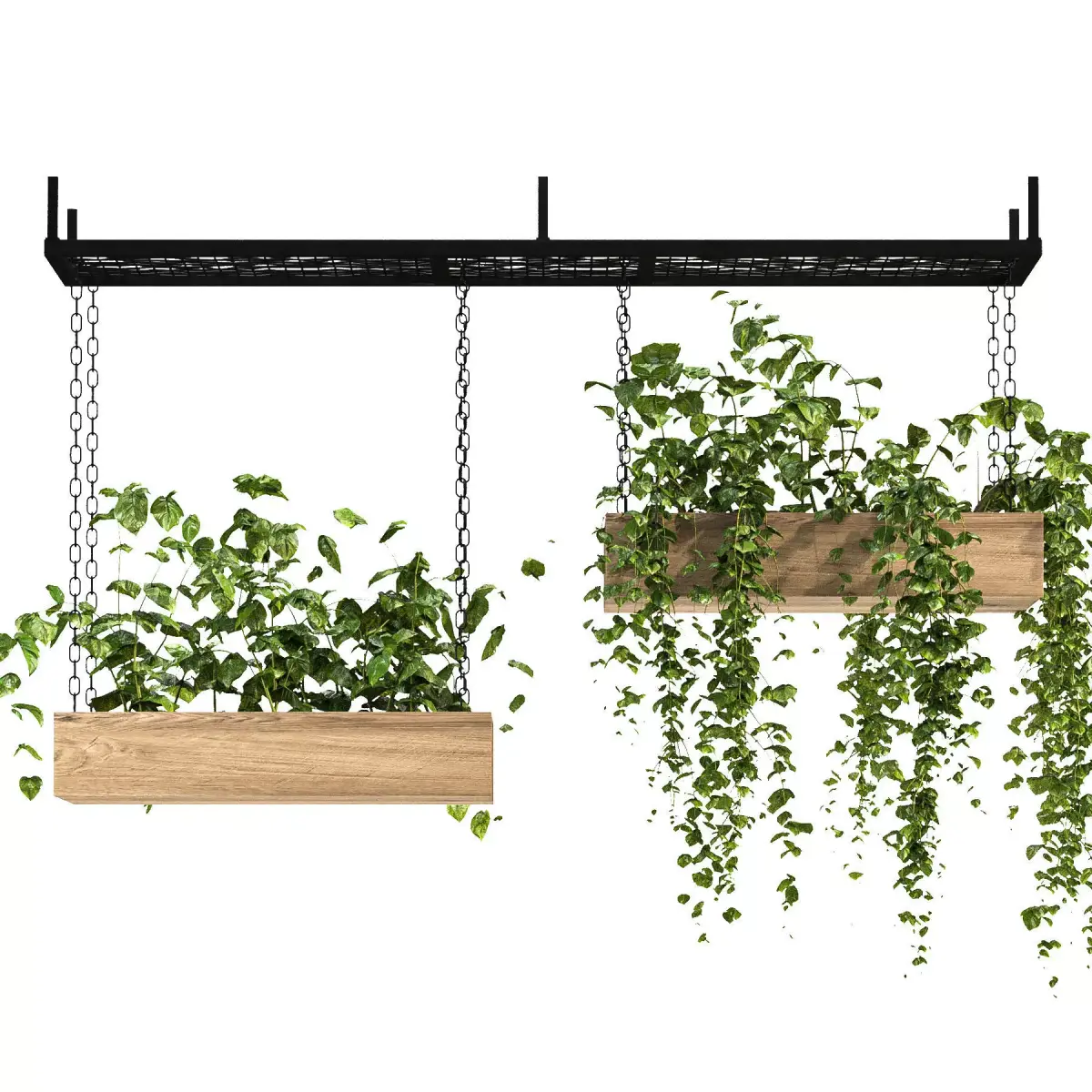 This model features a modern hanging planter system designed for ceiling-mounted interior greenery installations. It includes a black metal grid frame suspended by hooks, supporting two wooden planter boxes filled with detailed, lush foliage. One planter contains a compact, upright leaf arrangement, while the other showcases long, cascading vines that add a natural flowing effect.