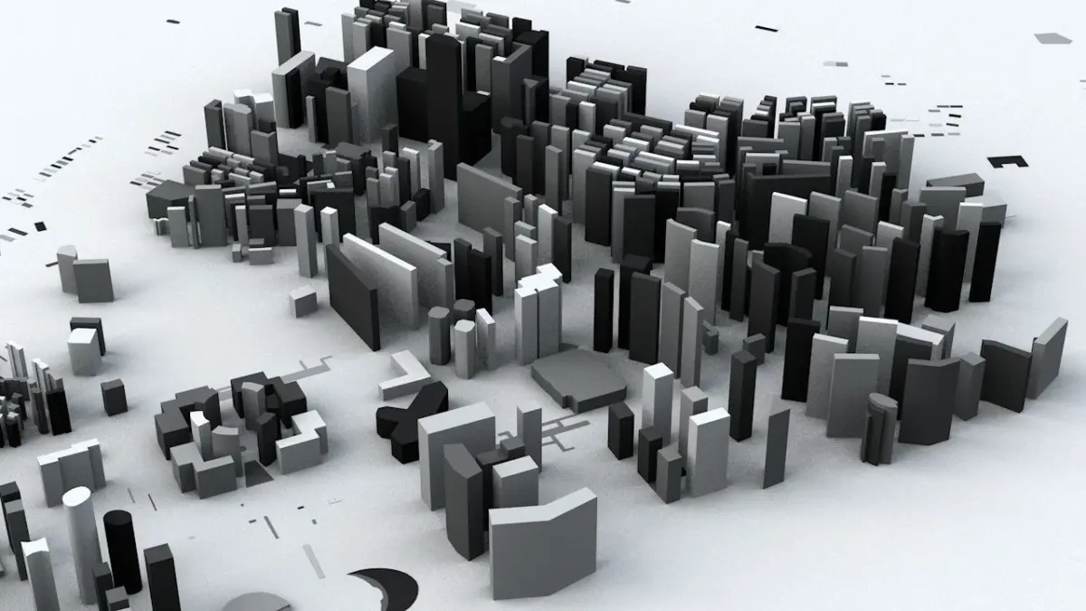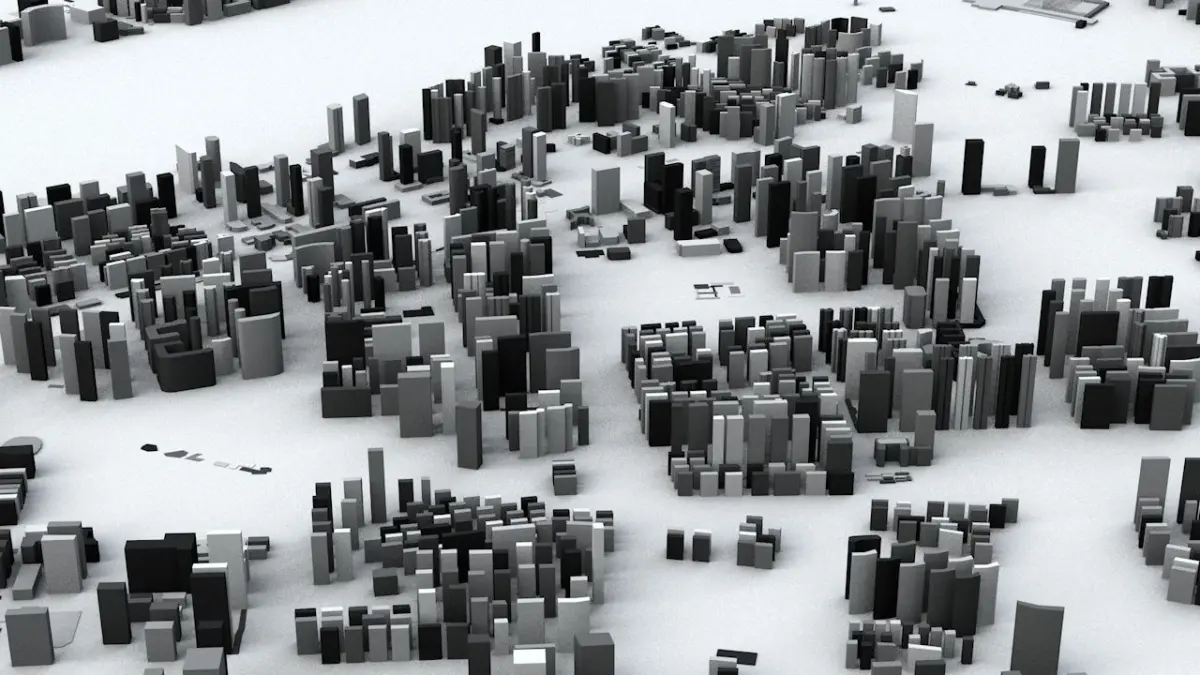- the model is positioned on a flat surface (all buildings are on the “floor” - no elevation data included)