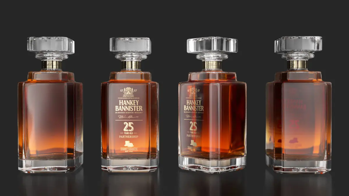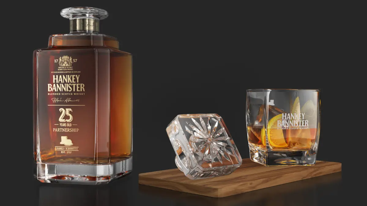 This is set of Hankey Bannister 25 YO Scotch Whisky. Contains HB 25 bottle of whisky with liquid inside, HB Glass with drink with ice and lemon, and a small oak serving board for a glass.