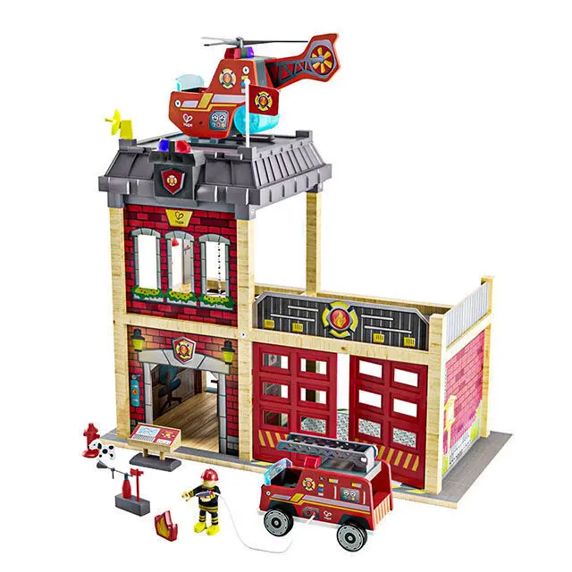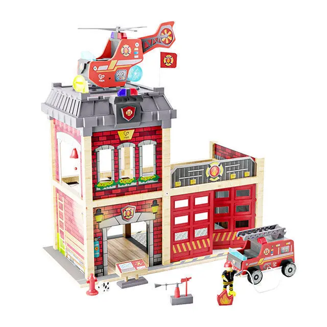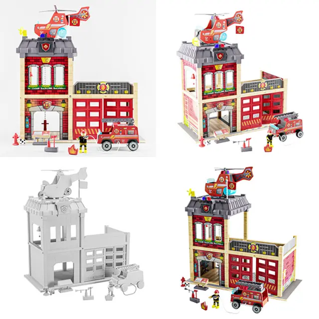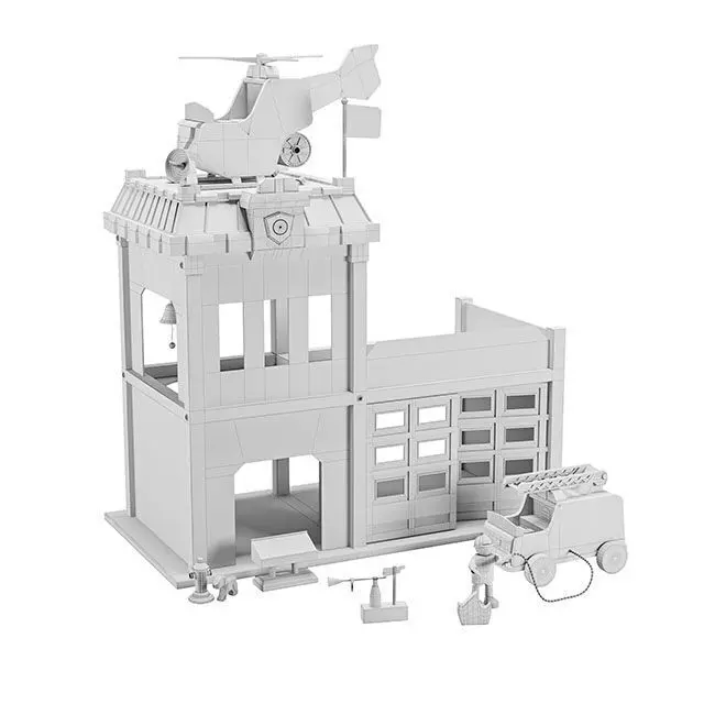 This high-quality 3D model represents a colorful and detailed children's fire station playset. The set includes a multi-level firehouse building with realistic textures, a fire truck, a firefighter figure, rescue accessories, and even a rooftop helicopter. Perfect for animation, toy design, games, or AR/VR projects. All elements are separated and optimized for easy customization.Corona render 5V_Ray 5uvw map = yesX-Form = yes
