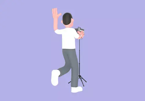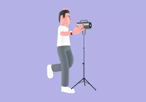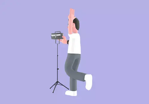 This cheerful 3D male photographer character is designed in a modern cartoon style, featuring a joyful pose with one leg lifted and a surprised or excited expression. He waves one hand in the air while holding a studio light or lighting equipment mounted on a tripod with the other. The dynamic and playful stance perfectly captures enthusiasm and energy in a creative work environment.