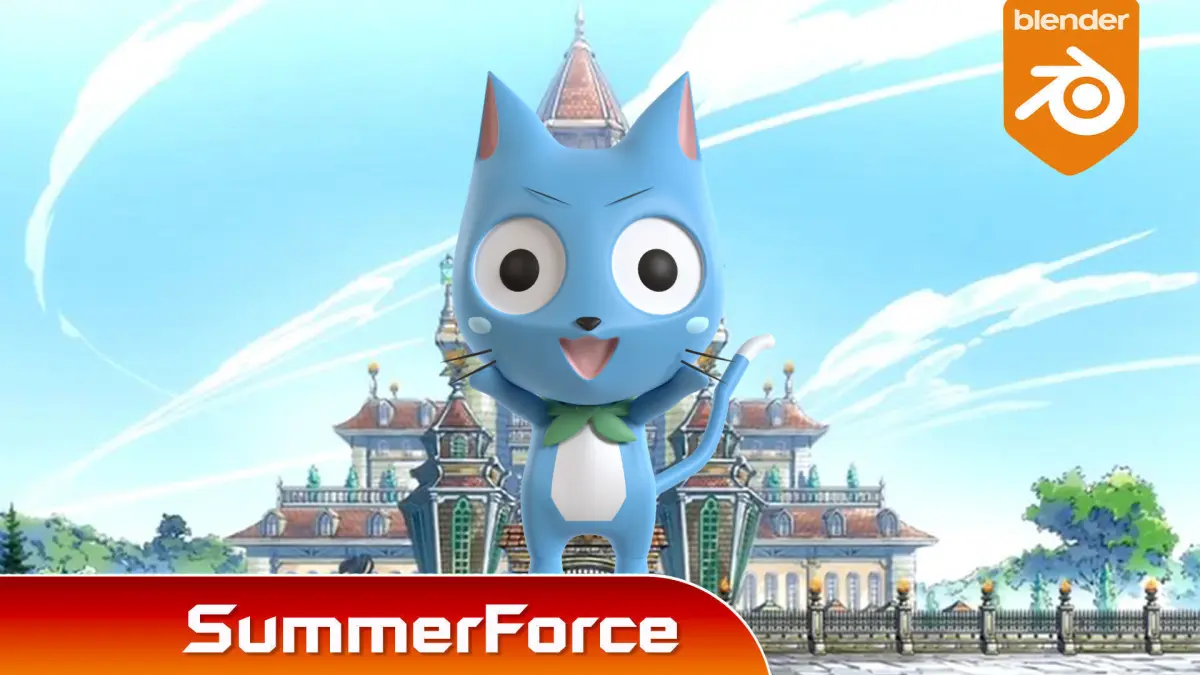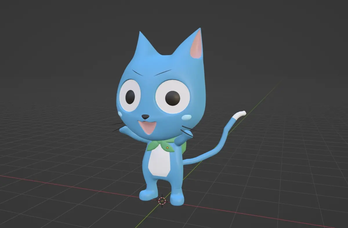 Happy is an Exceed from Extalia, and member of the Fairy Tail Guild, wherein he is a member of Team Natsu.Happy is a small blue Exceed with a white stomach. He has a rectangular head, with pink ears, big black eyes with small, thin eyebrows, and light blue cheek marks near to his tiny whiskers (two on each side of his face). Happy has a triangular nose that leads to semi-round upper lips on the sides. His body is rectangular too, and being an Exceed, it has a structure that allows him to walk erect, unlike normal cats. Despite having no thumbs, Happy is able to hold things. He has a long, white-tipped tail; and the other parts of his tail are blue. Additionally, Happy is able to use his tail to hold onto objects. Happy is usually seen carrying around a green backpack, where he keeps food and items that can be used in battle. This backpack also covers his green Guild Mark that is on his back. When using his Magic, he can grow a pair of large, feathered, angel-like wings that allow him to fly around and carry others. Happy usually does not wear clothes, the only few times being during the Fantasia Parade, to disguise himself in Edolas, and when his parents gave him clothes, again in Edolas.