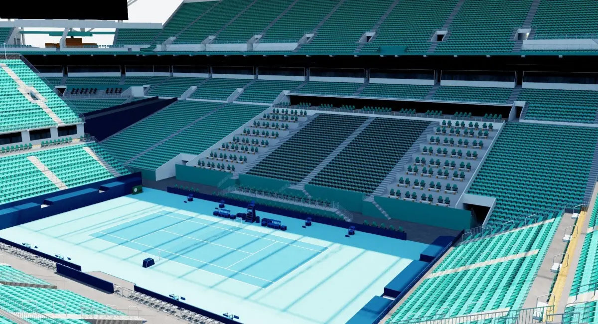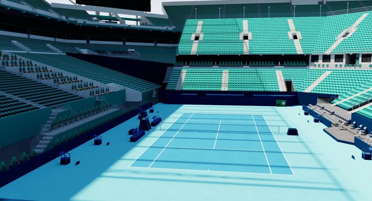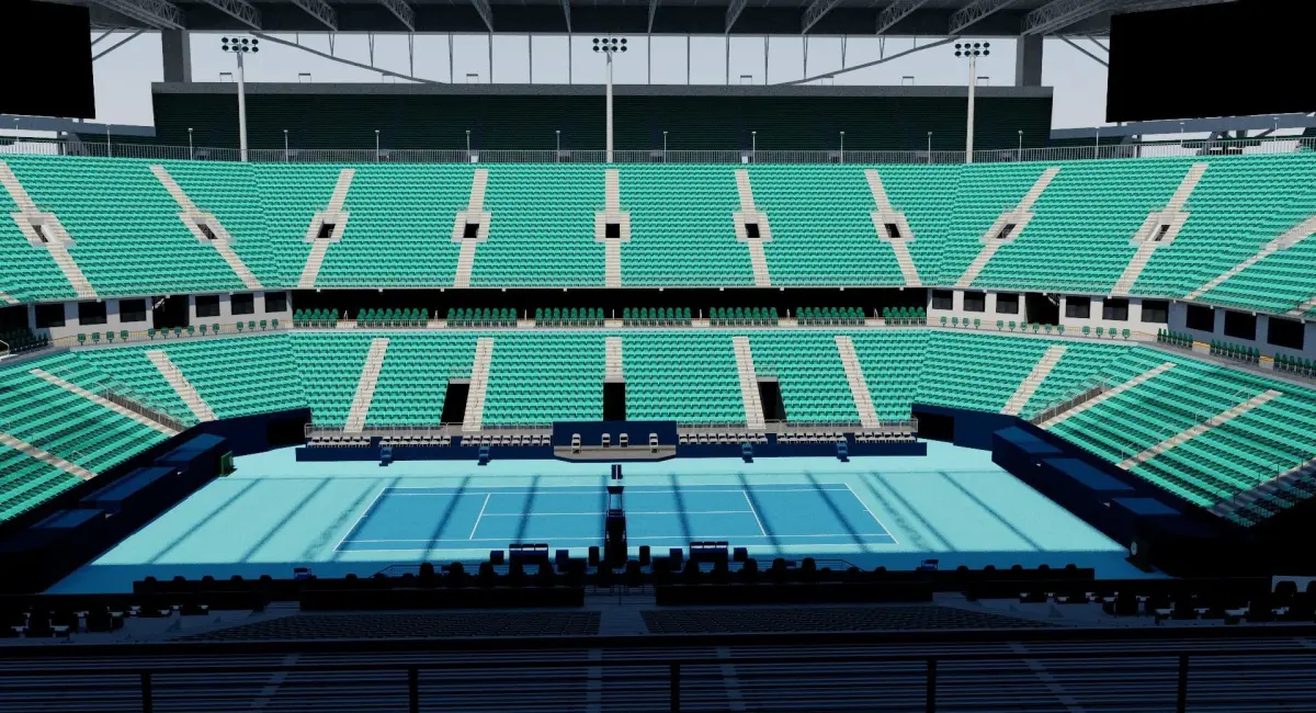 Hard Rock Stadium is a multipurpose stadium located in Miami Gardens, Florida, a city north of Miami. In November 2017, the Miami Open tennis tournament announced that it would move from Crandon Park in Key Biscayne to Hard Rock Stadium in 2019. However, the family who originally owned the land filed a lawsuit that blocked their construction, as their agreement to donate the site to Miami-Dade County in 1992 contained a stipulation that only one stadium may be built on the site. To host the tournament, 29 permanent courts (including 11 tournament courts, with one being a 4,993-seat grandstand court) were built on Hard Rock Stadium's south parking lots. The stadium proper serves as center court, using a modified, 13,800-seat configuration with temporary grandstands constructed on the playing surface, placing the court roughly between the two 30-yard lines. The move to Hard Rock Stadium was praised by players and fans because of the ample space the complex provides.