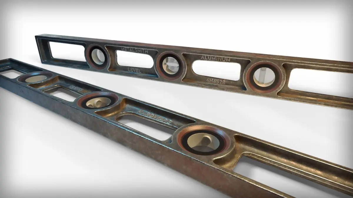 Old, antique level made of mostly alluminum, paint and glass.