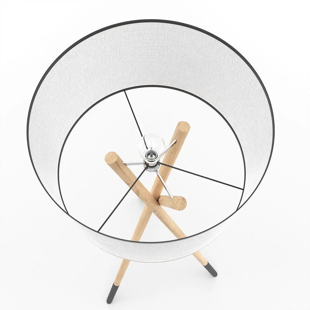 Tripod floor lamp with crossing wooden legs and cylindrical fabric lampshade, to ensure warm and cozy lighting.