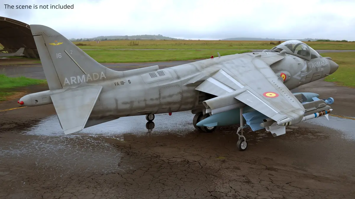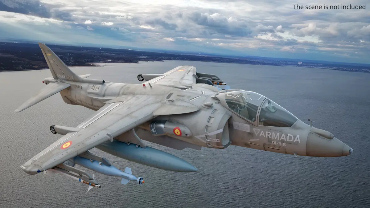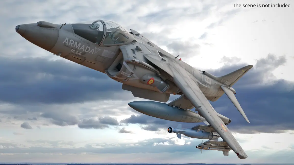 This model accurately depicts the unique design features of the Harrier, including its thrust vectoring nozzles and compact, robust structure. The aircraft is equipped with various armaments and fuel tanks, showcasing its versatility in combat and reconnaissance missions. Its detailed rendering highlights the distinctive shape and surface details, providing an authentic representation.