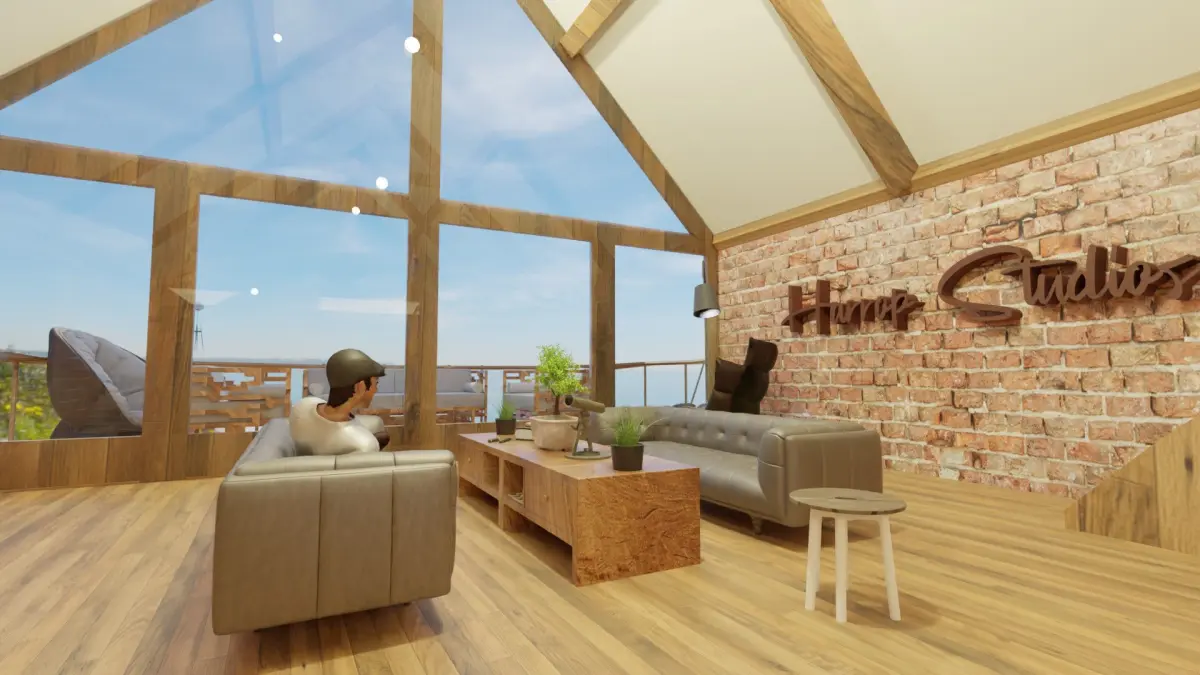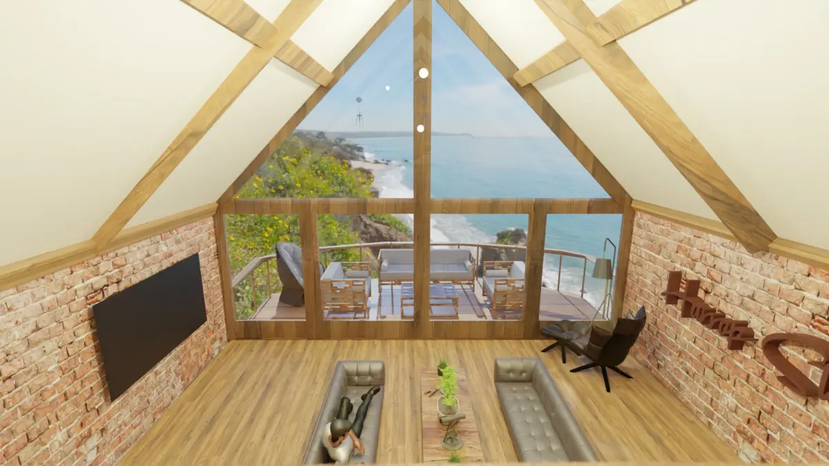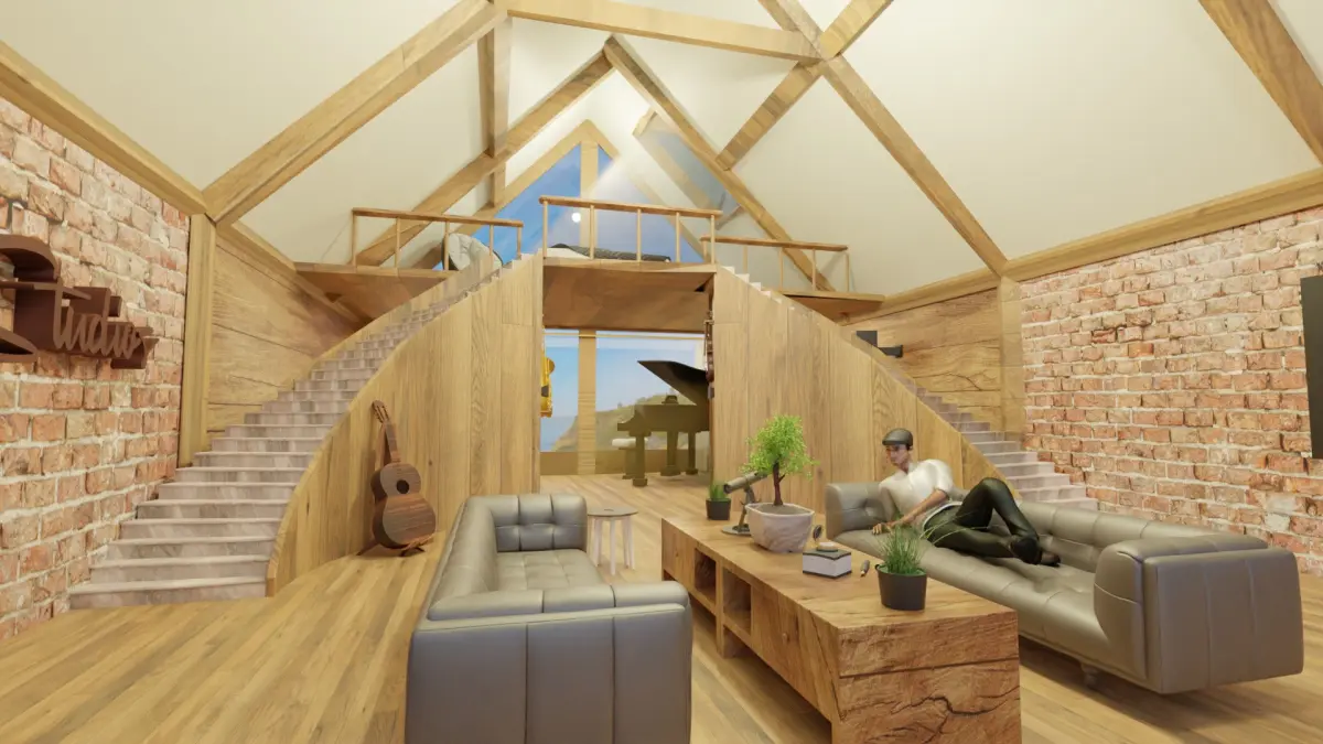 This is a cabin design that features multiple different elements. A music section has a violin-piano and saxophone as well as a bed with views out onto the main window.
