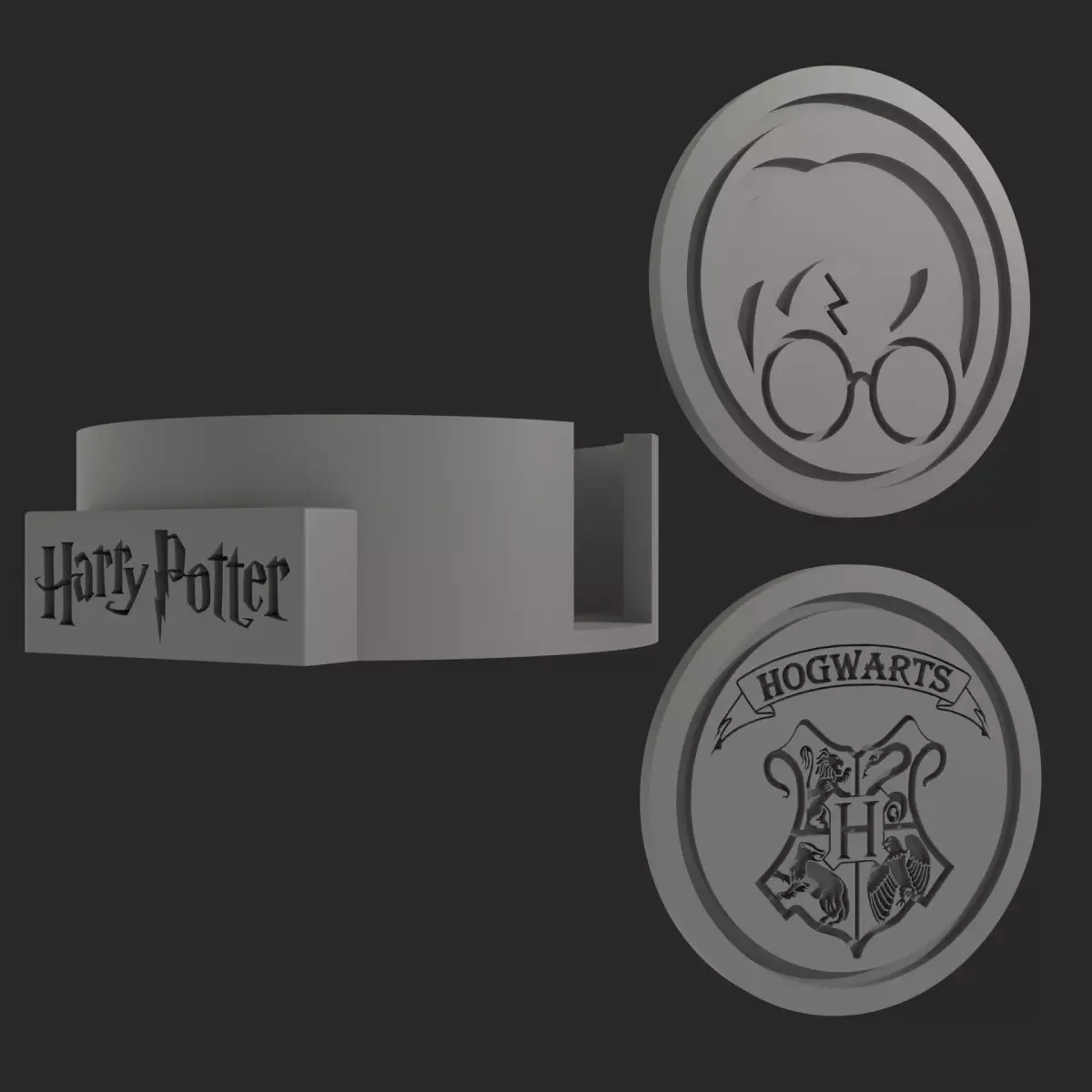 The kit includes 4 coaster STL files featuring the logos of the 4 Hogwarts houses (Gryffindor, Slytherin, Ravenclaw, and Hufflepuff) + 1 STL of the Hogwarts School of Witchcraft and Wizardry logo + 1 STL of Harry Potter + 1 STL custom Harry Potter case.