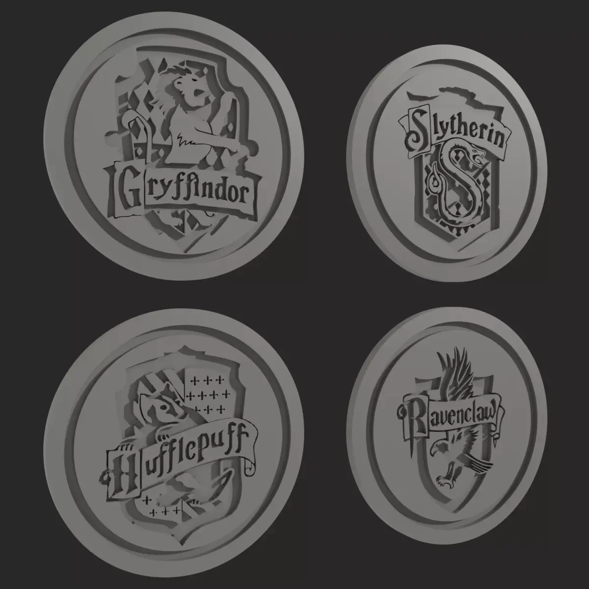 • 4 STL files with Hogwarts house coaster designs: Gryffindor, Slytherin, Ravenclaw, and Hufflepuff