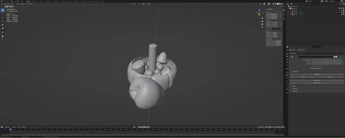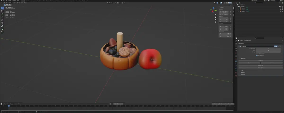 This is a two piece blender and dae file (OBJ is included), which comes to a total of 2,152,602 vertices. In Second Life (test location) at typical table size decor, this item is 1 Land Impact.