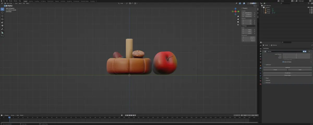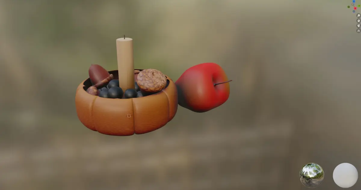 Textures are provided with the model, which include a face for the apple, pumpkin, and candle as a single texture, the acorns and berries as two other textures. For use in SL, there are normals, speculars, UVs, and AOs.