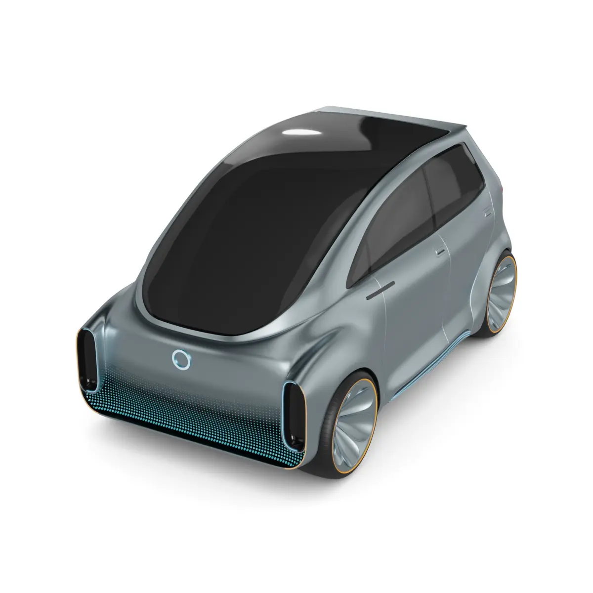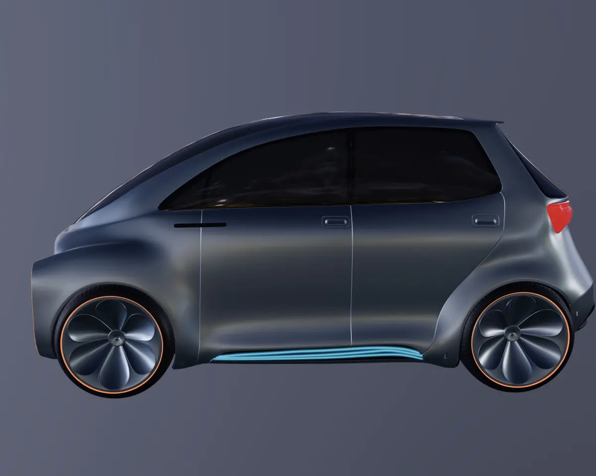 A sleek, futuristic hatchback with a metallic silver finish, featuring smooth curves and glowing neon accents, designed for efficient and eco-friendly urban transportation in the advanced world of tomorrow.