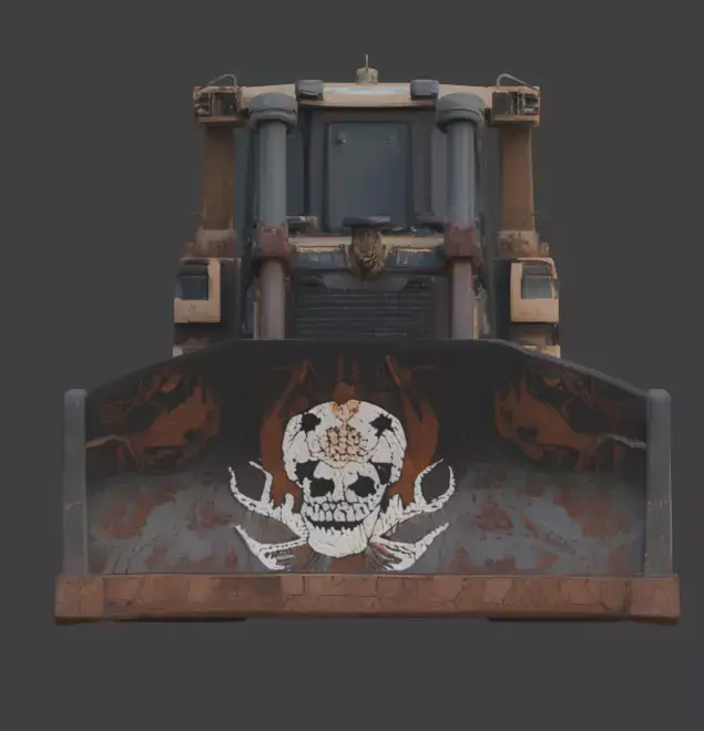 Infuse your digital construction site with pure terror using this high-quality, 3D model of a haunted gothic bulldozer. Designed with a dark, macabre aesthetic, this heavy machinery asset features a weathered black and tan body, heavily detailed with realistic paint cracks, grime, and extensive rust buildup. The standout feature is the massive front blade, which is chillingly adorned with a large, central skull graphic and flanked by claw-like illustrative engravings.