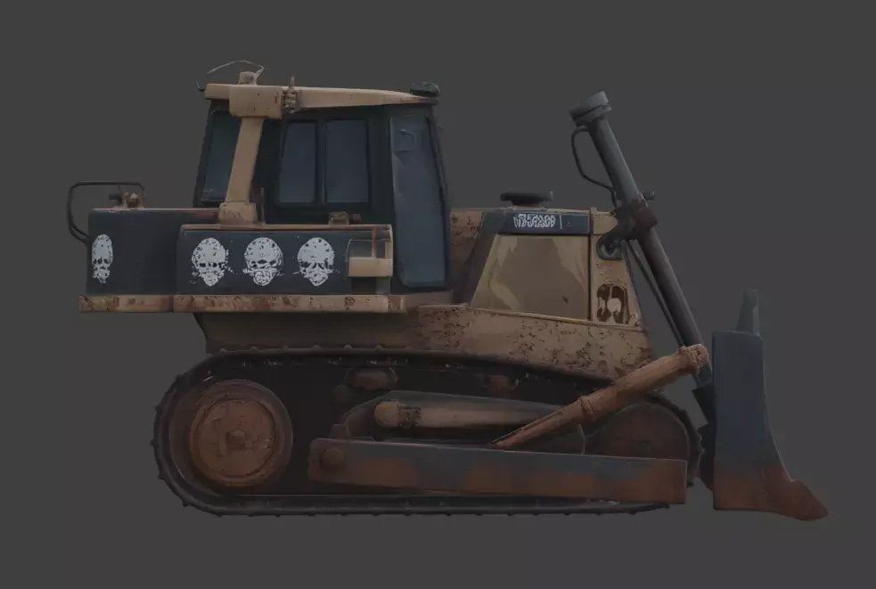 Tagshorror bulldozer, haunted machinery, heavy equipment, gothic design, skull engraving, weathered, 3d model, game asset, dark fantasy, rusted, industrial horror, macabre, cinematic prop, realistic, creepy, construction vehicle, demonic, supernatural, death, 3d prop