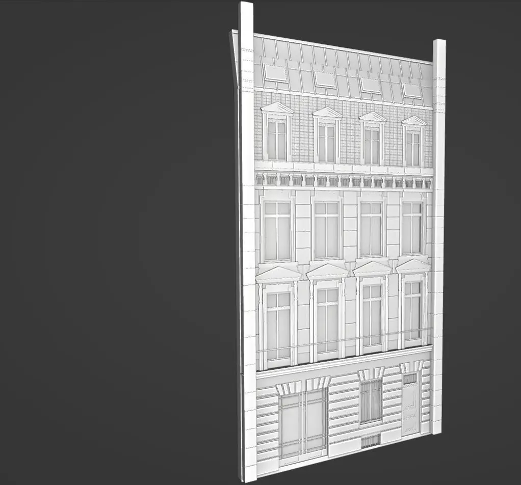 French building in Paris, style Haussmanien, made with blender. No UV, No textures, every object is separate, use modifiers (array).