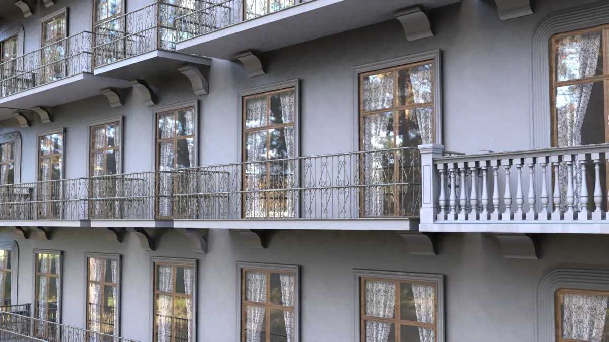 Detailed facade with ornate balconies and realistic wooden doors