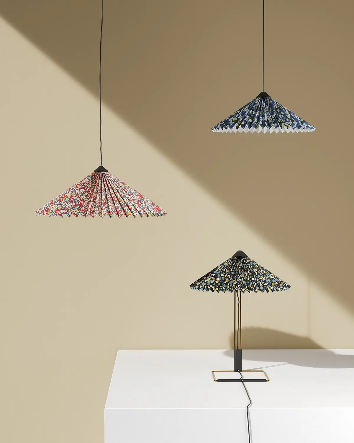 Featuring Liberty’s distinctive floral print on the Matin Shade’s classic pleated construction, the Liberty Matin lamps and pendants bring together two iconic designs in a poetic and timeless expression. The elegant shade of table lamps is combined with a steel wire bent frame in polished brass. The whole collection brings an inviting atmosphere to most rooms in the home and comes in different sizes and selected Liberty prints.