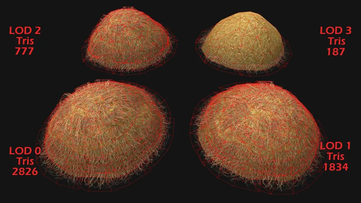 Game ready model.Stylized and detailed Stack of Hay Straw Medium Pile fully textured, sculpted and rendered with Physical based rendering (PBR) - Shown images have been rendered in Marmoset Toolbag .The models contains lods, detailed information on the images.