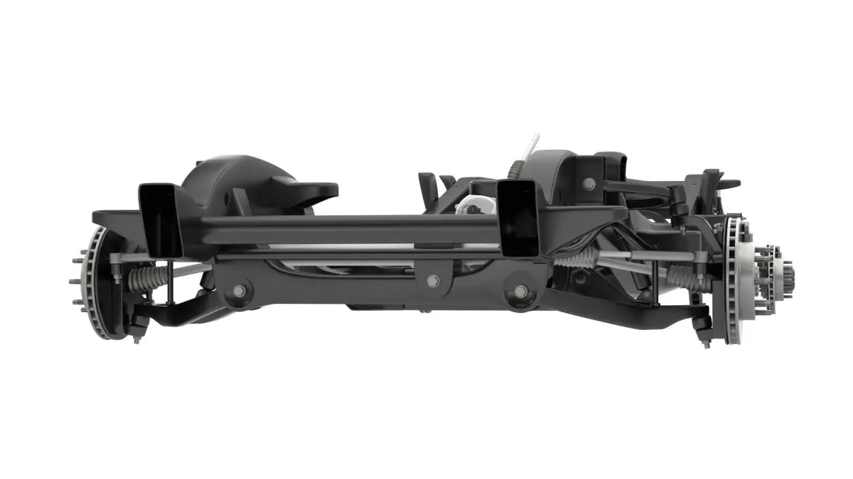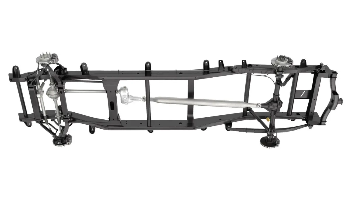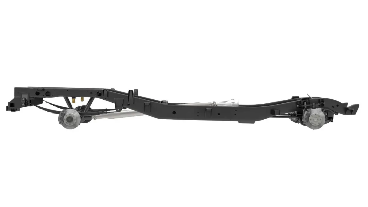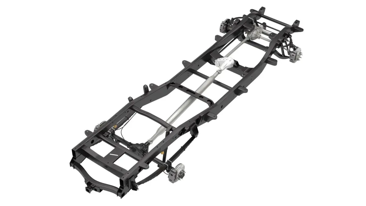 3D model of a modern 4wd chassis for a crew cab short bed heavy duty pickup truck with independent front suspension.