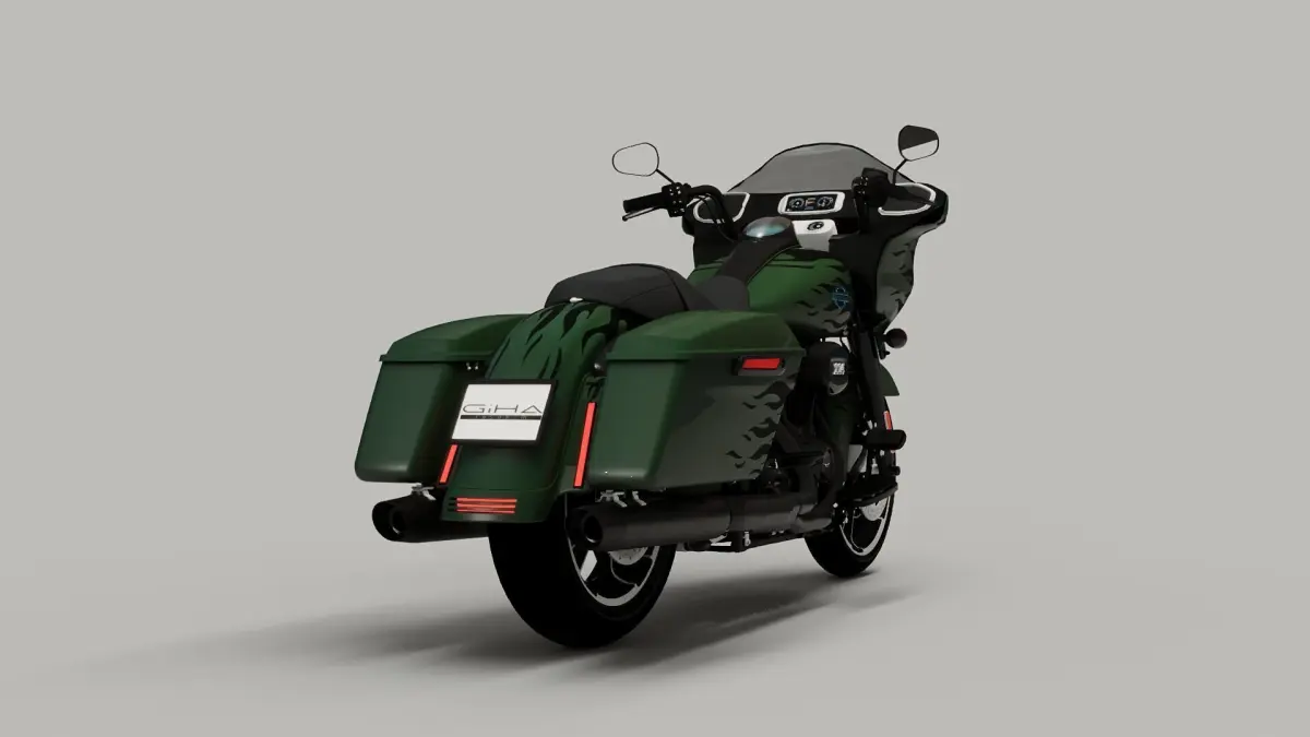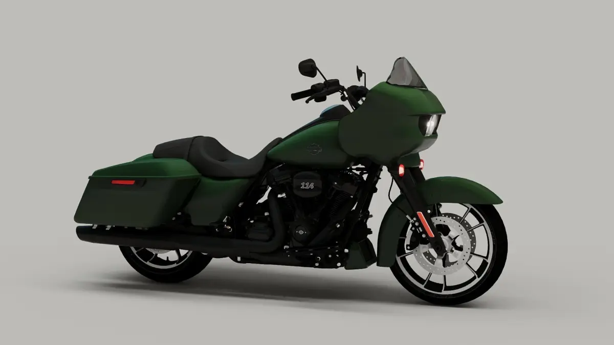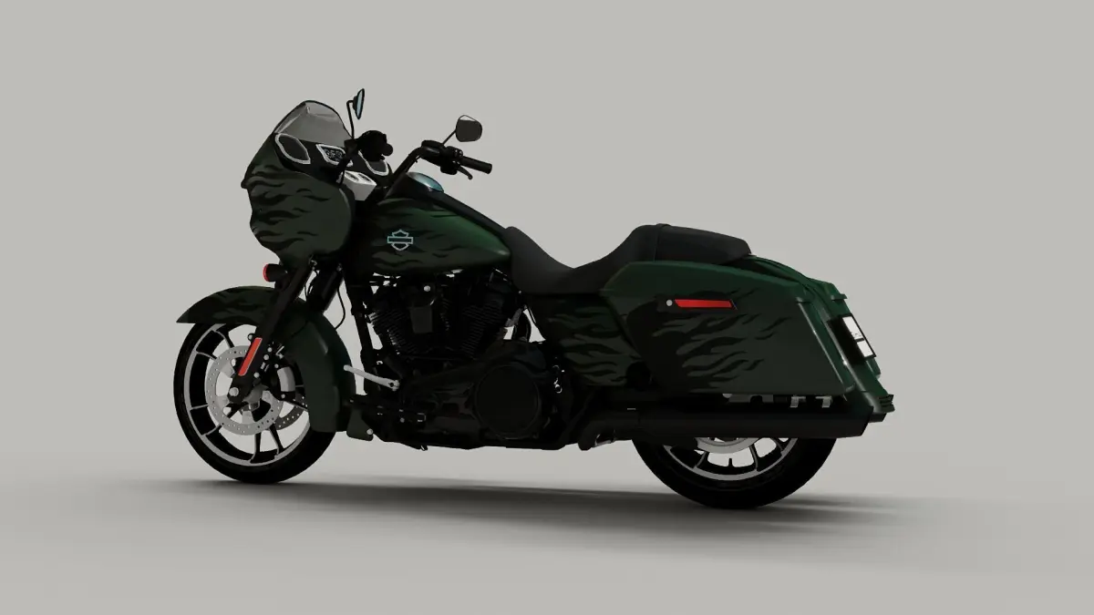 This 3D model represents the Harley Davidson Road Glide, accurately capturing the essential design and structure of the original motorcycle.
