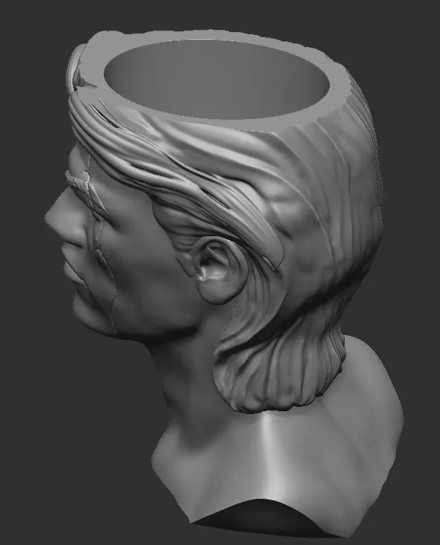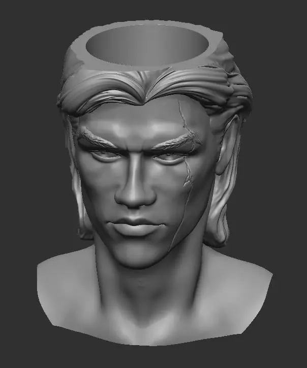 Sculptured head of brutal man with scar, suitable for home or street decor. Theres also variant that can be useful as container for flowers. (See the pictures)The model is Hi Poly and suitable for 3D Printing, or wood cutting machine.