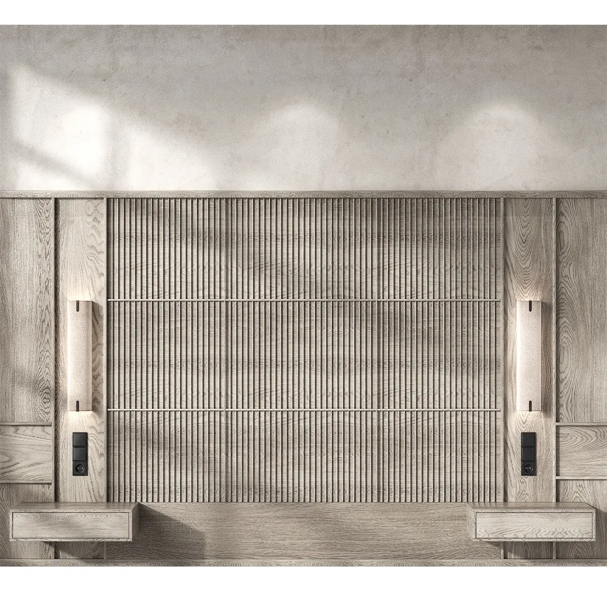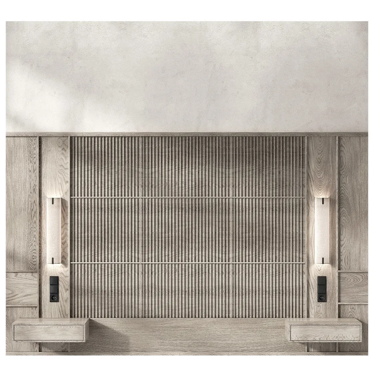 The 3D model contains a set of decorative wall panels for decorating a bedroom interior.Decorating the wall behind the bed using designer panels made of thin wooden slats.The composition contains decor: Astro Lighting Elba sconces, sockets, switches, bedside hanging tables.High-quality seamless textures of wood, walls.All objects, materials and textures have logical names.Suitable for styles: modern, Japanese, Scandinavian, Japandi, minimalism