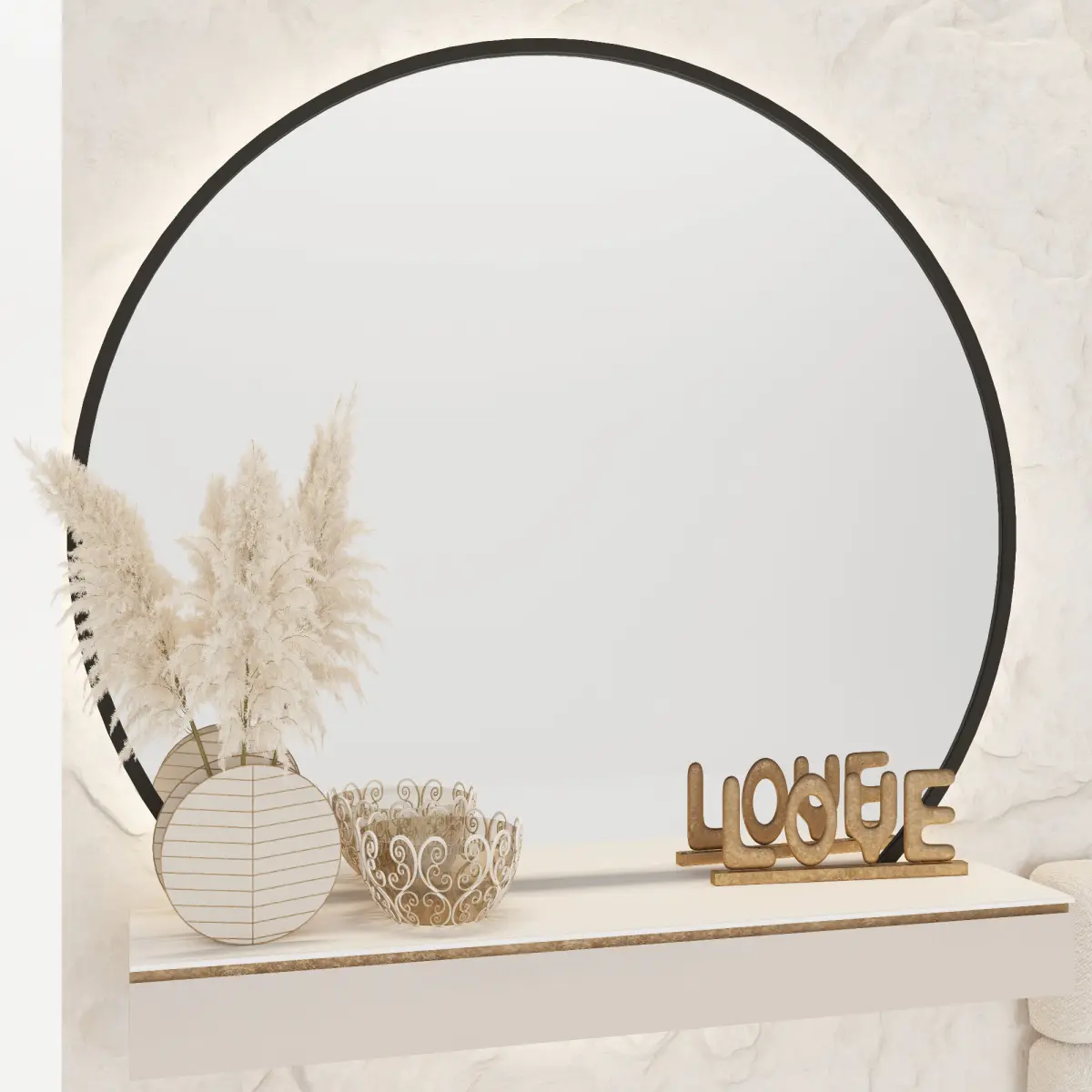 - круглое зеркало с подсветкой-мягкое изголовье-декор