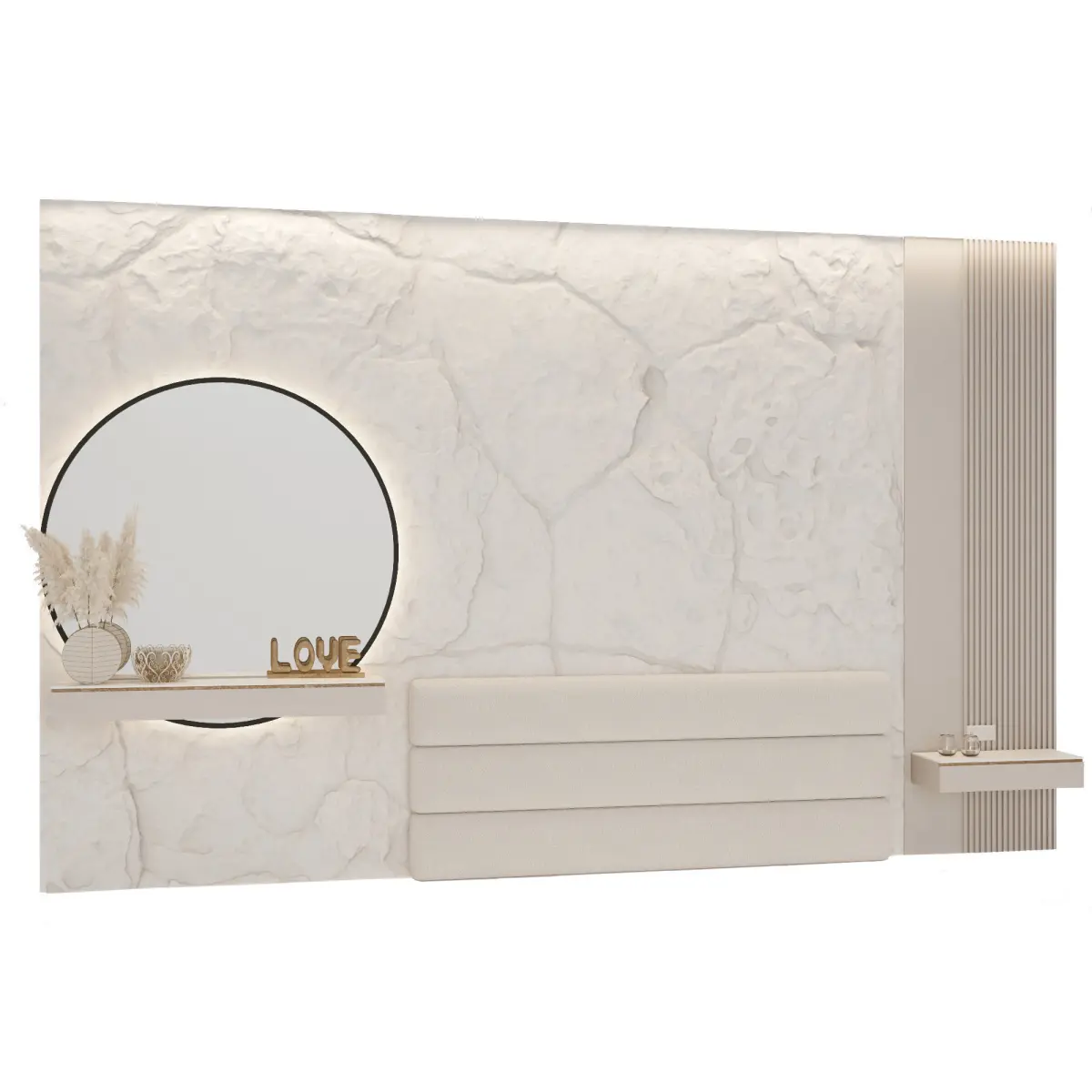 В сцене присутствуют:-декоративная каменная стенка-деревянные рейки-прикроватная тумба-консоль