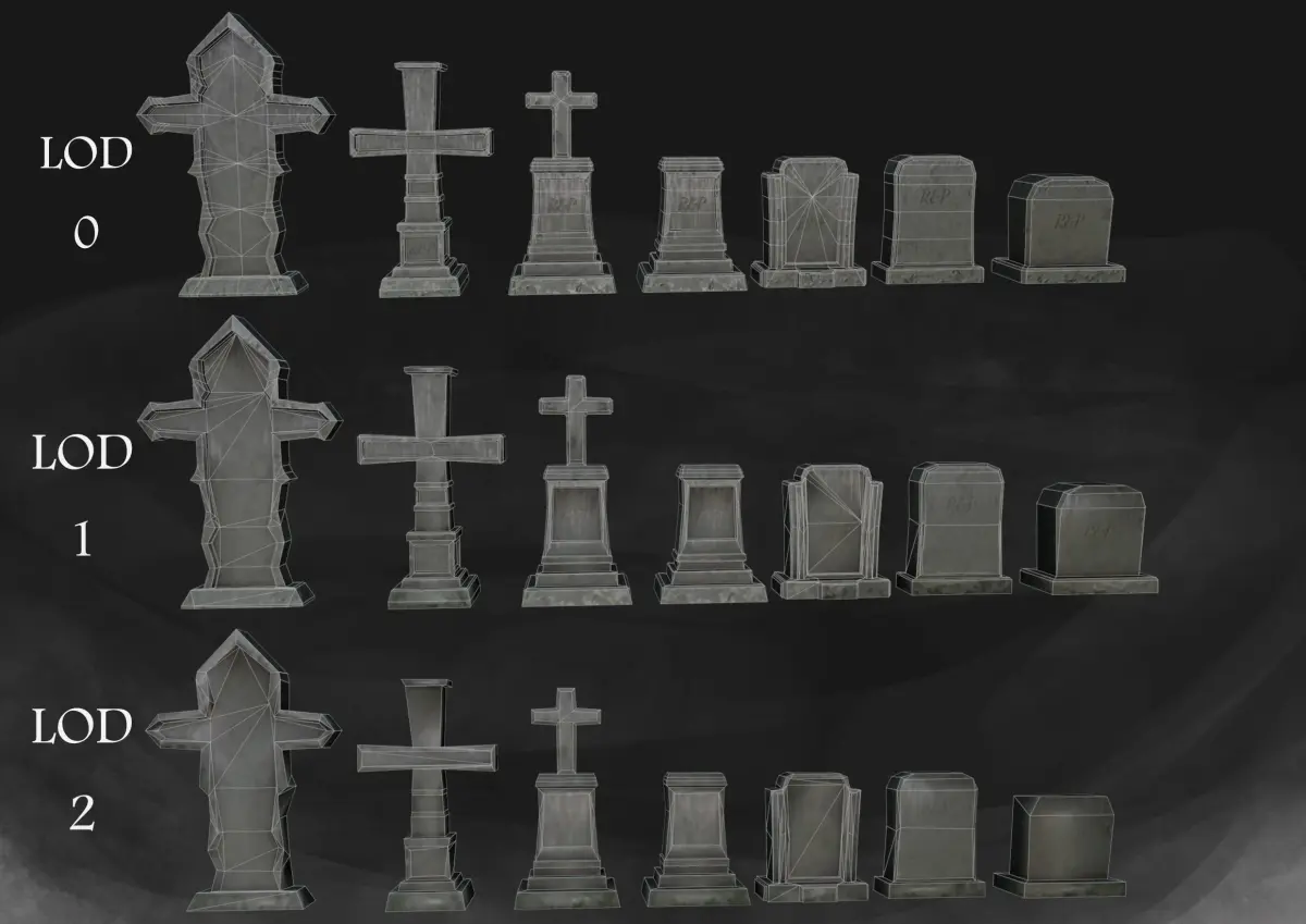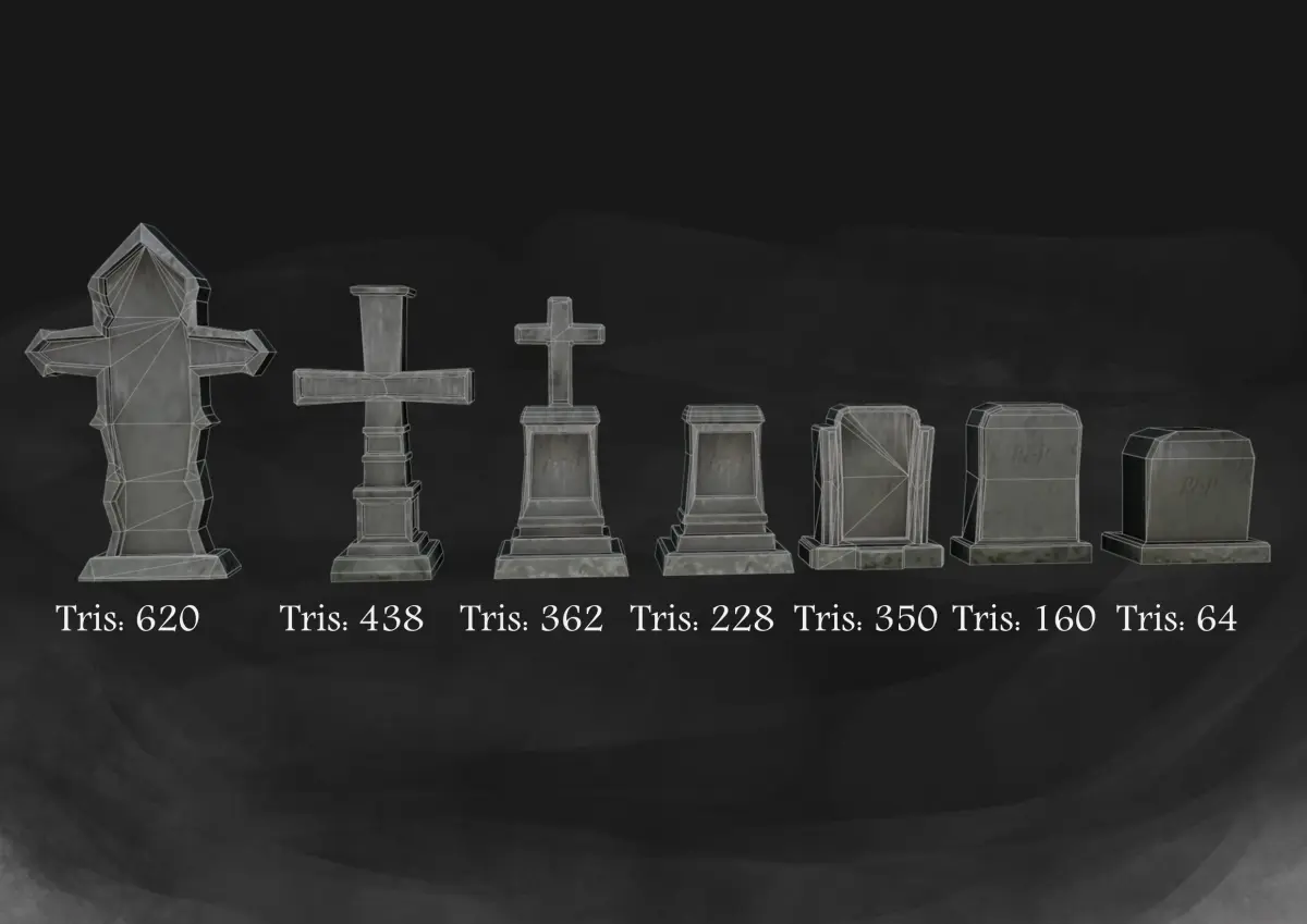 HeadstoneThe set contains 7 models.Models are ready to be imported into the game engine, suitable for casual games with simple graphics, each model has 3 levels of detail, which will help in optimizing your project.Also for the model there are textures with a resolution of 1024, 512, 256px.All textures are in the archive Headstone_Texture.rarThe models are made in Blender, but are available in the following formats:blendFBXMLTOBJSLTThe files are in the file folder.