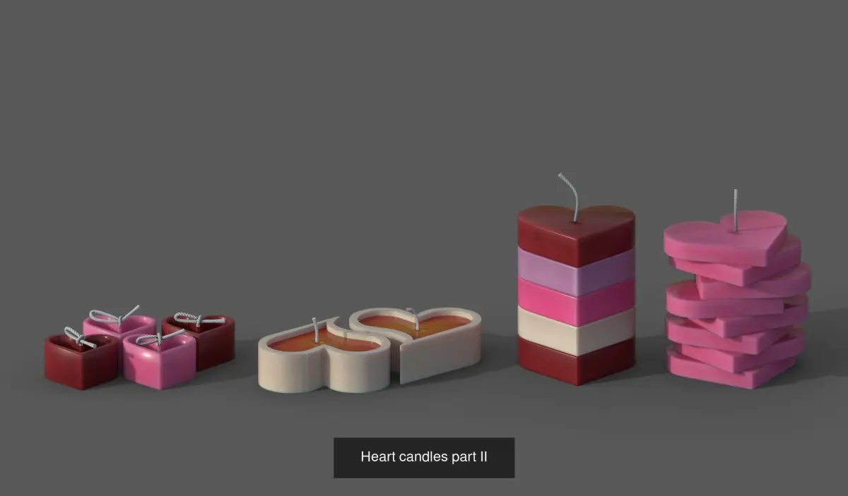 All these objects together you can find in the next files: Heart candles part II.max file, Heart candles part II.FBX file and Heart candles part II.OBJ file. And separate files: Candle4.FBX, Candle5.FBX, Candle6.FBX and Candle7.FBX and Candle4.OBJ, Candle5.OBJ, Candle6.OBJ, Candle7.OBJ.