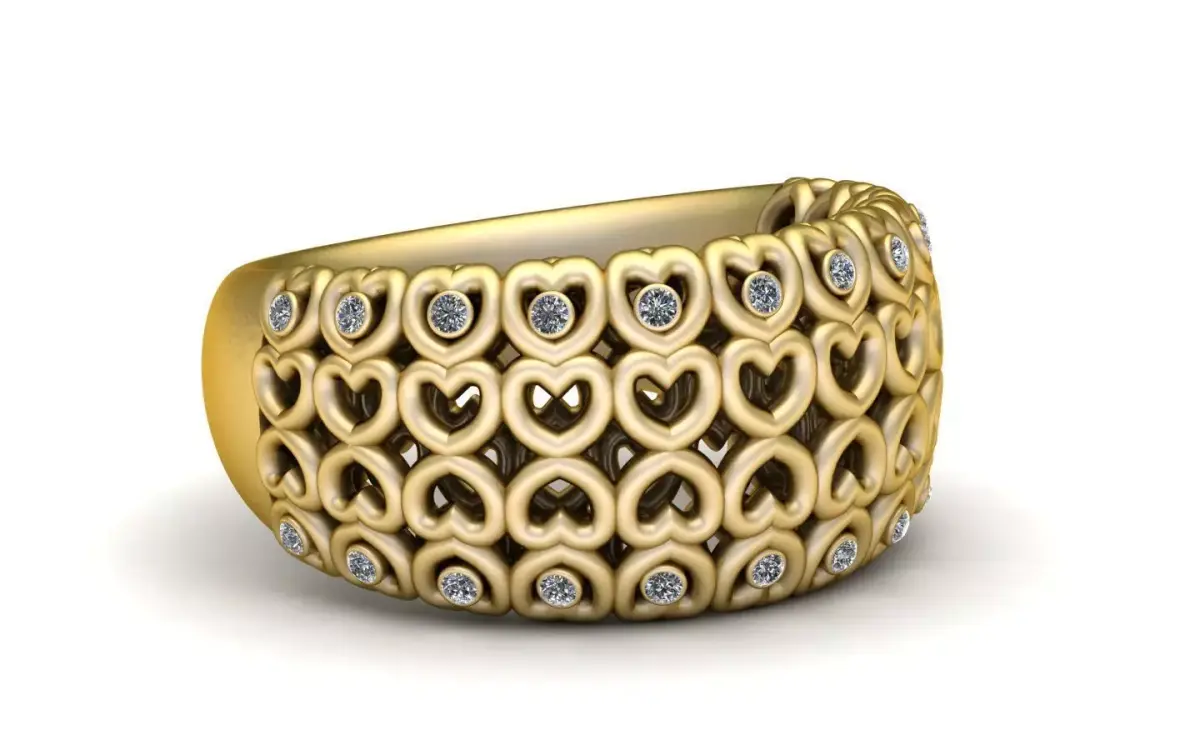 Celebrate love and elegance with this enchanting gold ring featuring a seamless arrangement of petite heart motifs. Each heart is delicately sculpted and meticulously spaced to create a textured, romantic pattern across the domed surface. Interspersed among the hearts are sparkling round-cut diamonds, adding a touch of brilliance and sophistication. Perfect as a gift of affection or a statement of personal style, this ring merges modern charm with timeless symbolism.