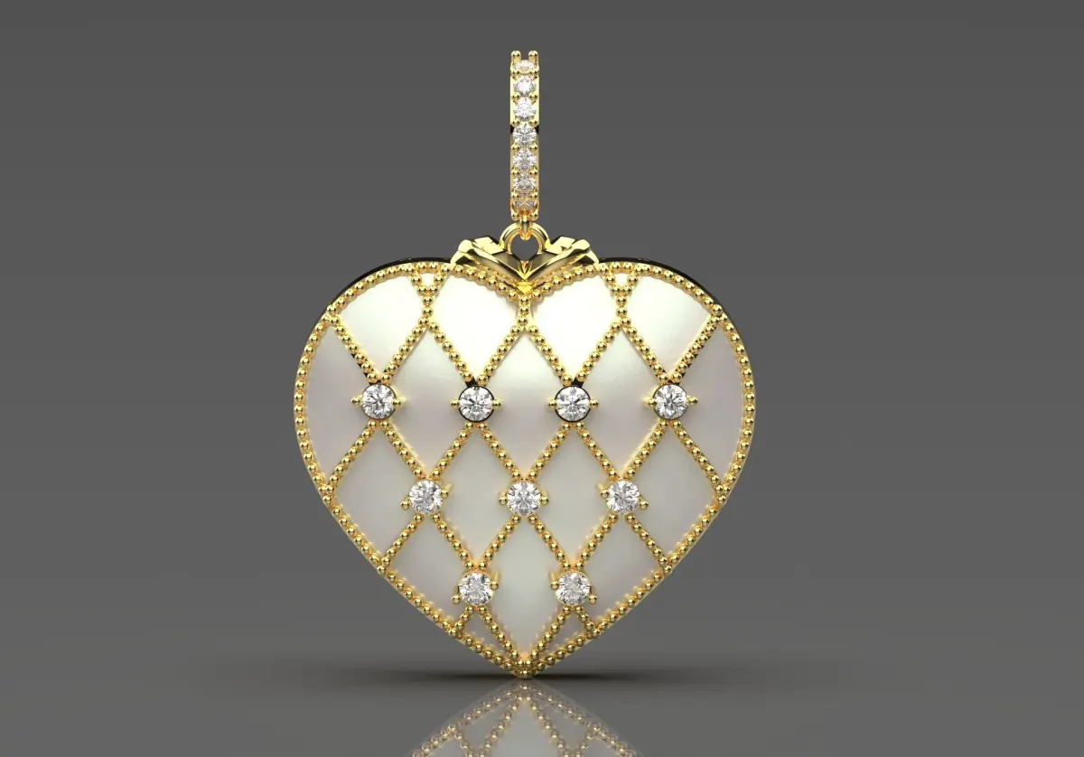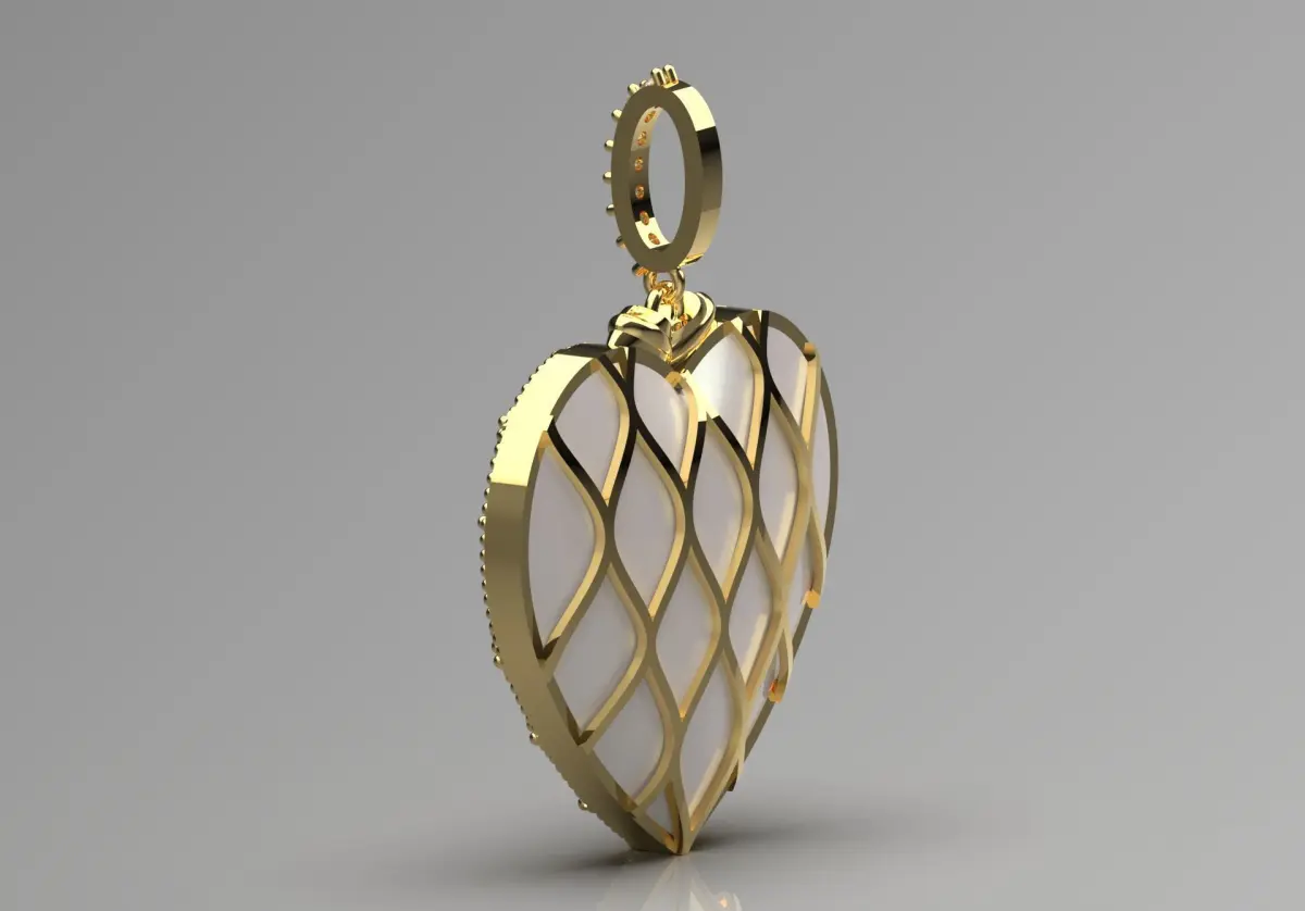 This pendant features a beautiful heart shape, beautifully crafted with a yellow gold frame. The exterior is decorated with a delicate lattice pattern that creates a diamond-like effect. Each diamond-shaped segment is enhanced with small sparkling diamond stones, which brilliantly catch the light. The heart has a soft glow, made of mother-of-pearl, adding a mesmerizing depth to the piece.