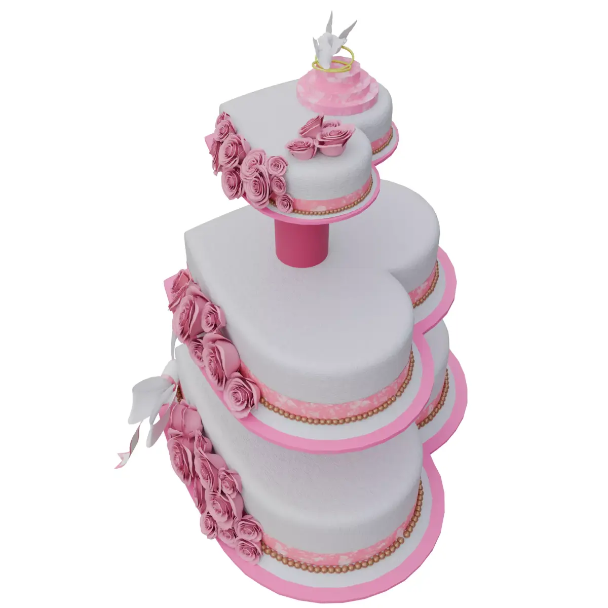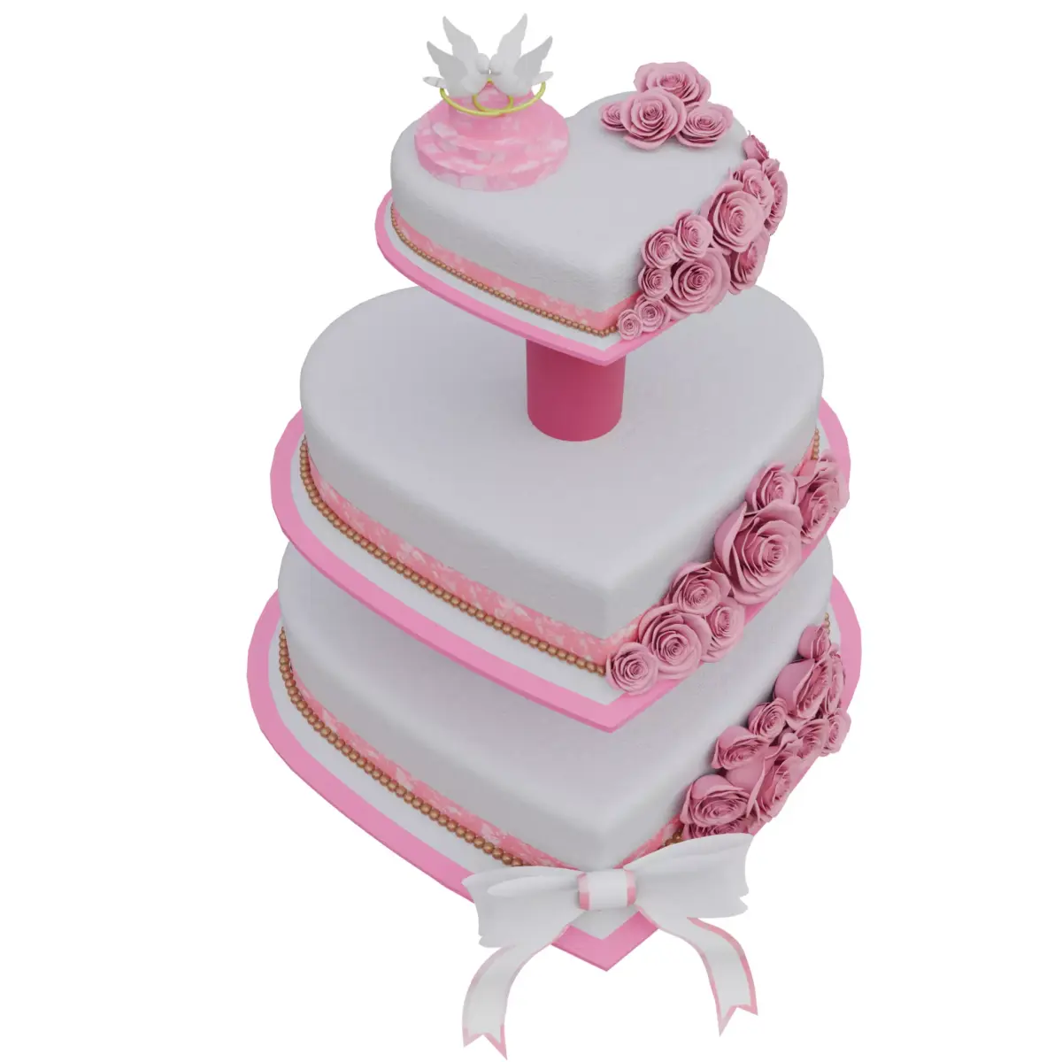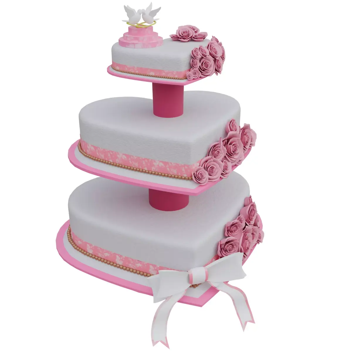 Bring elegance and romance to your scenes with this high-quality 3D Wedding Cake model. This unique tiered cake features a heart shaped design decorated with pink roses and a white bow — perfect for weddings, anniversaries, parties, and celebration scenes.
