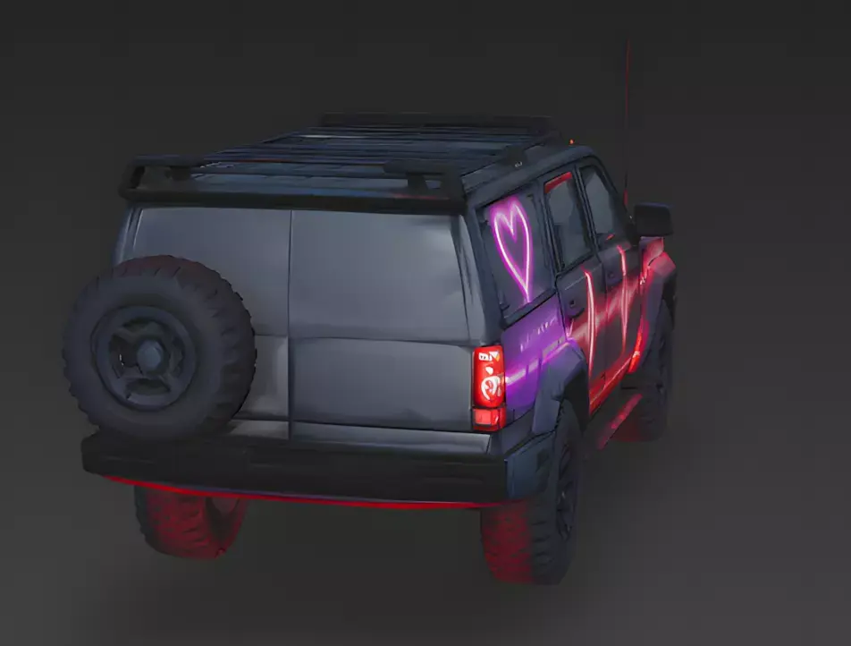 Illuminated Heart Icon On the rear side window panel, there is a large, glowing neon heart. Along with the pink underglow lighting beneath the chassis, these details make the vehicle unmistakable even in the darkest night levels.