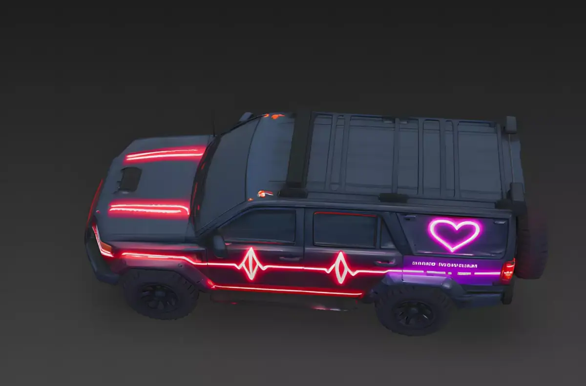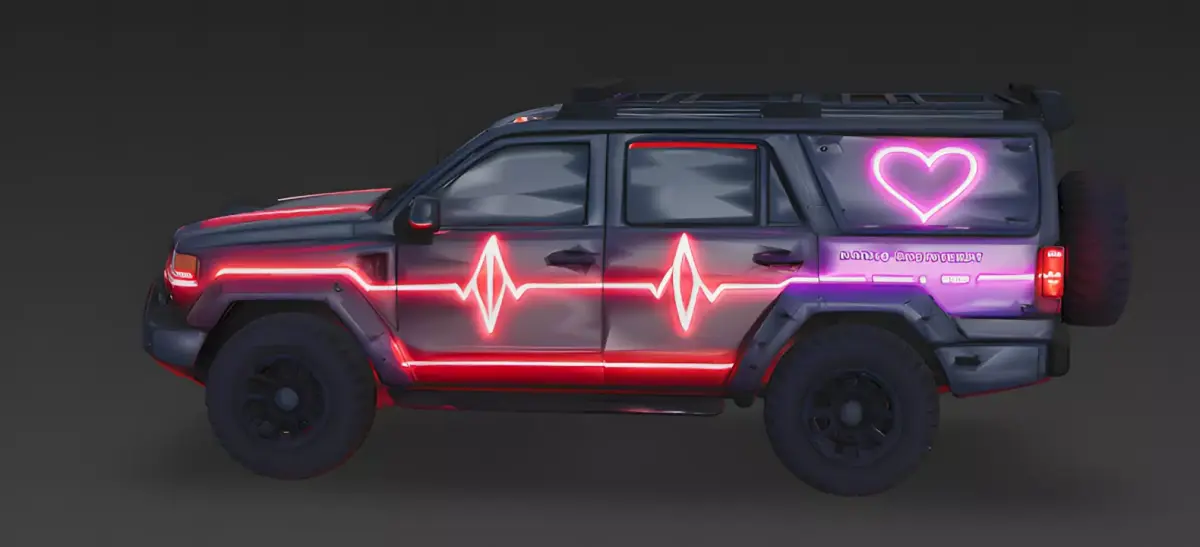 Neon ECG Heartbeat Strip The defining feature is the bright neon pink light strip running along the entire side and front grille. Shaped like an ECG heartbeat monitor line (zigzagging up and down), it visually suggests life support or adrenaline.