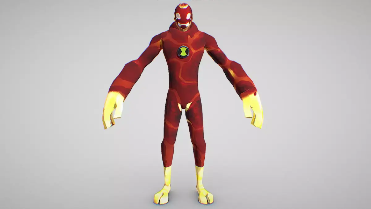 In Omniverse, Heatblast looks the same as he did in Ultimate Alien, only his eyes are once again connected to the fire on his head, like in the Original Series. He is taller and more muscular, his face's design is different, and his shoulder plates are slightly tilted up. His feet are also redesigned. 16, 10, and 11-year-old Heatblast share the exact same design with the exception of the ring around the Omnitrix symbol, which is silver in the 11-year-old version and white in the 16-year-old version.