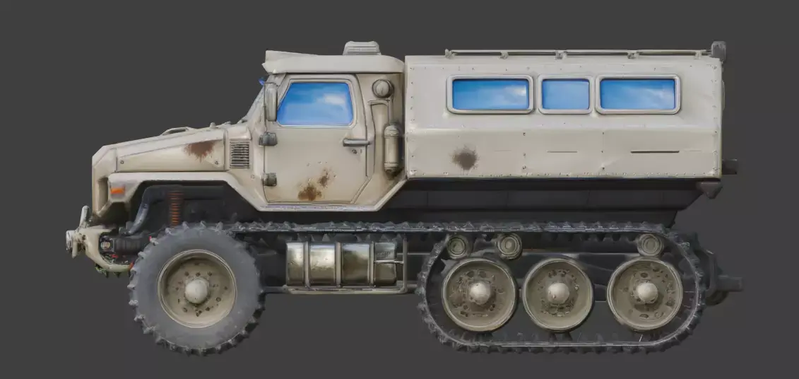 Heavy All-Terrain Half-Track 3D ModelDescriptionA realistic 3D game asset of a Heavy All-Terrain Half-Track, featuring a unique hybrid propulsion system with massive front tires and a rear caterpillar track assembly.
