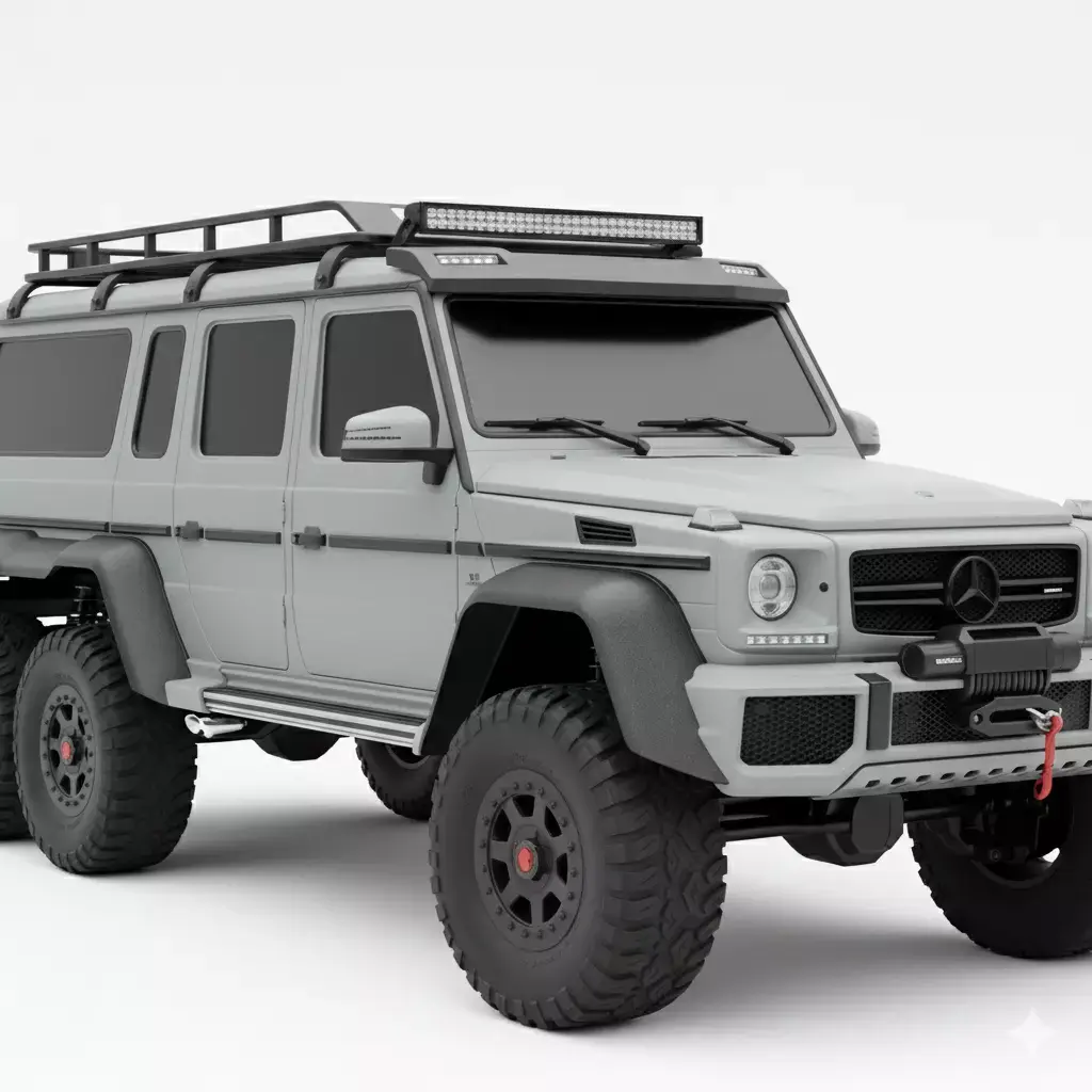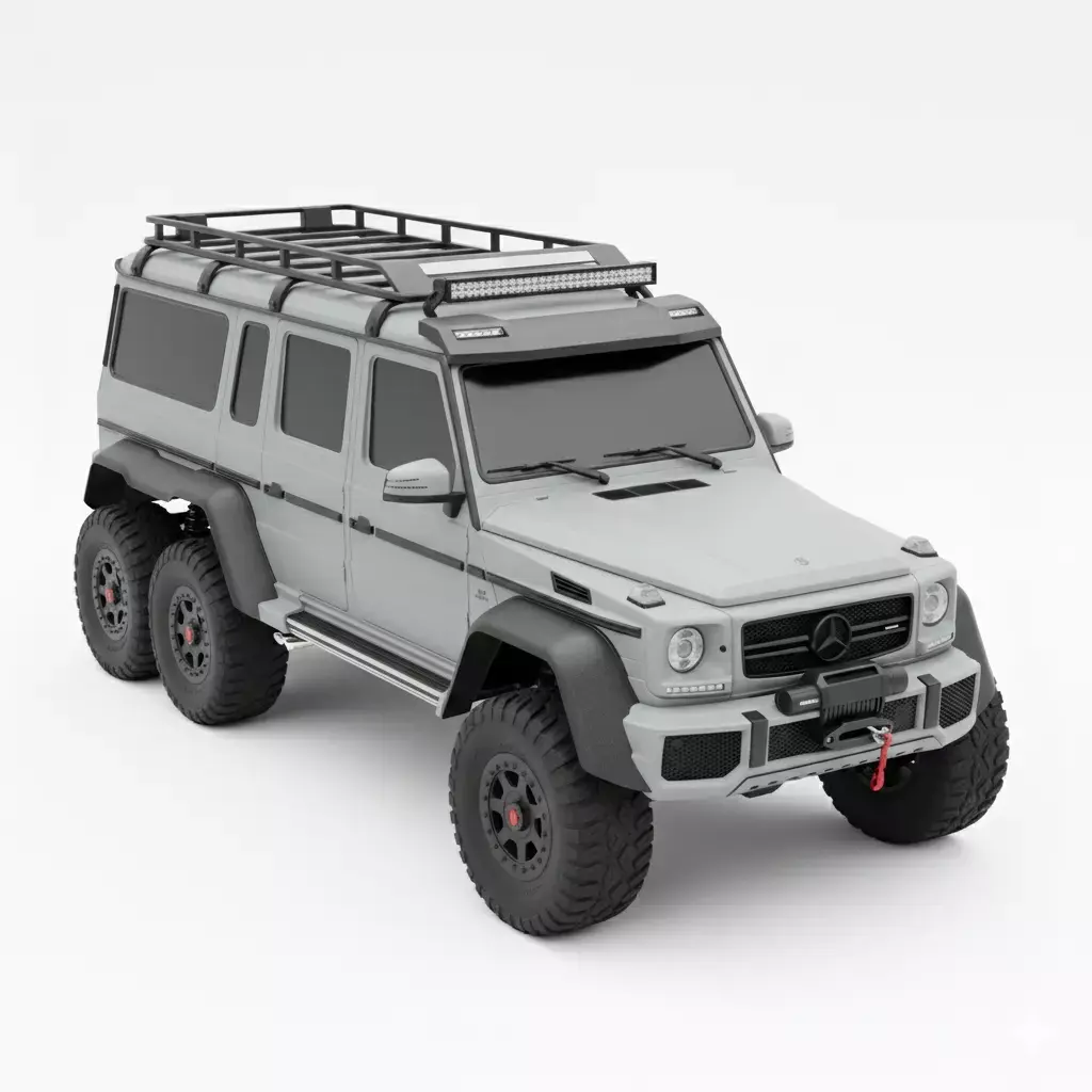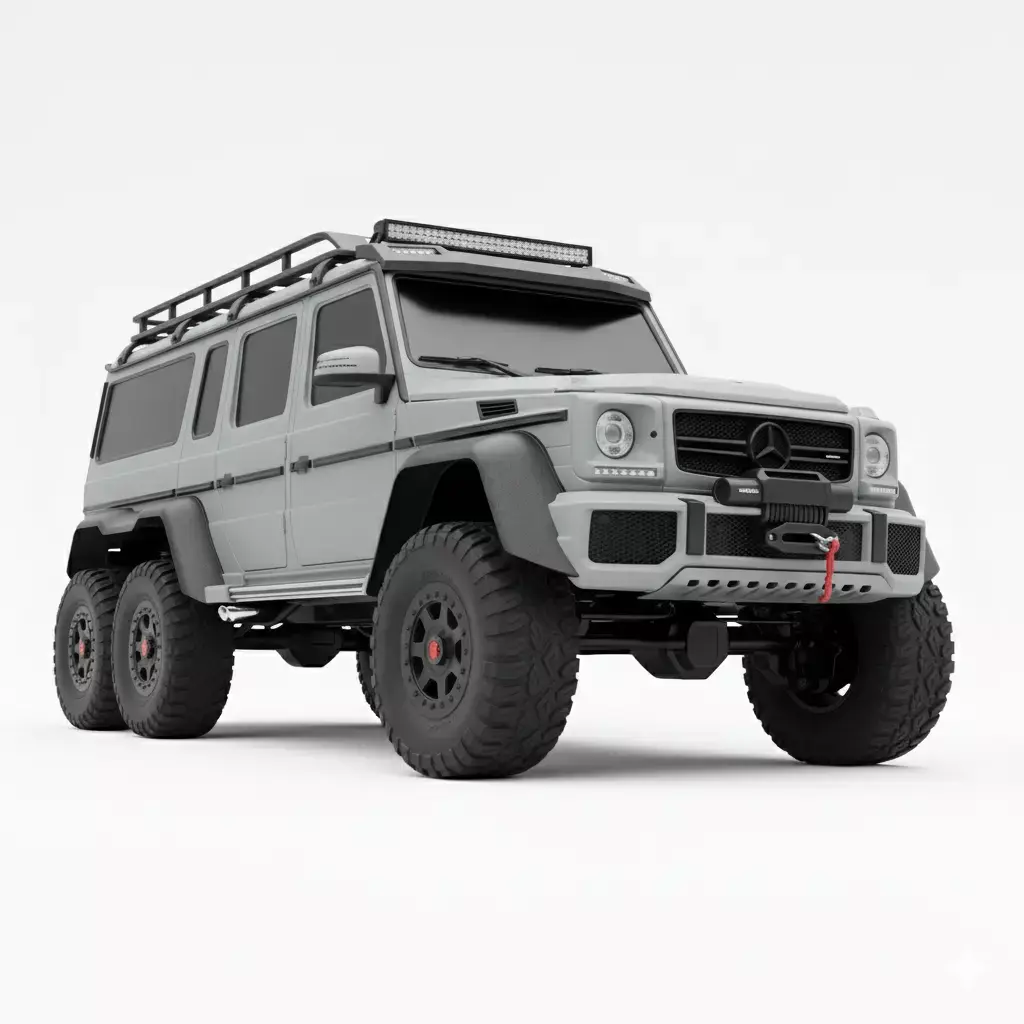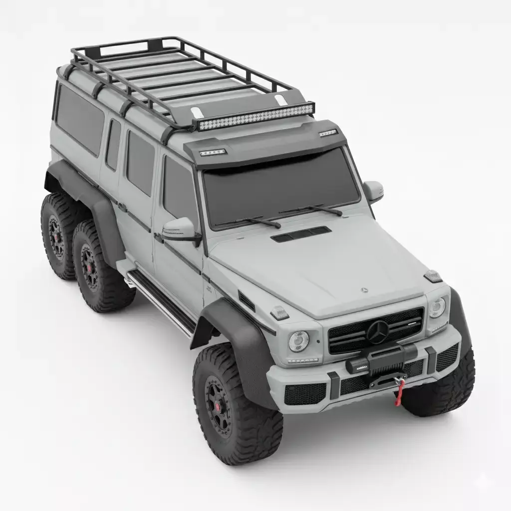 This is a detailed 3D model of a highly customized and aggressive 6x6 SUV, resembling a heavily modified luxury off-road vehicle. The model is rendered in a matte light gray finish and features numerous extreme off-road modifications, including an extra axle for a six-wheel-drive configuration, massive all-terrain tires, robust fender flares, and an elevated suspension. Functional additions for overlanding and rescue include a front-mounted winch, a large roof rack, and a powerful LED light bar above the windshield. This high-detail asset is suitable for projects that require a powerful, commanding presence in extreme terrain scenarios, such as simulations, game environments, or high-end visualizations.